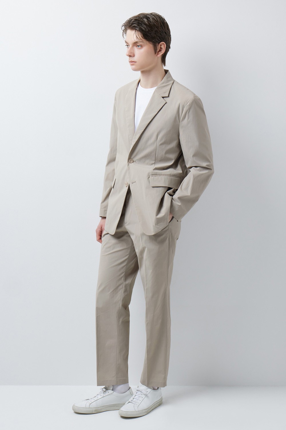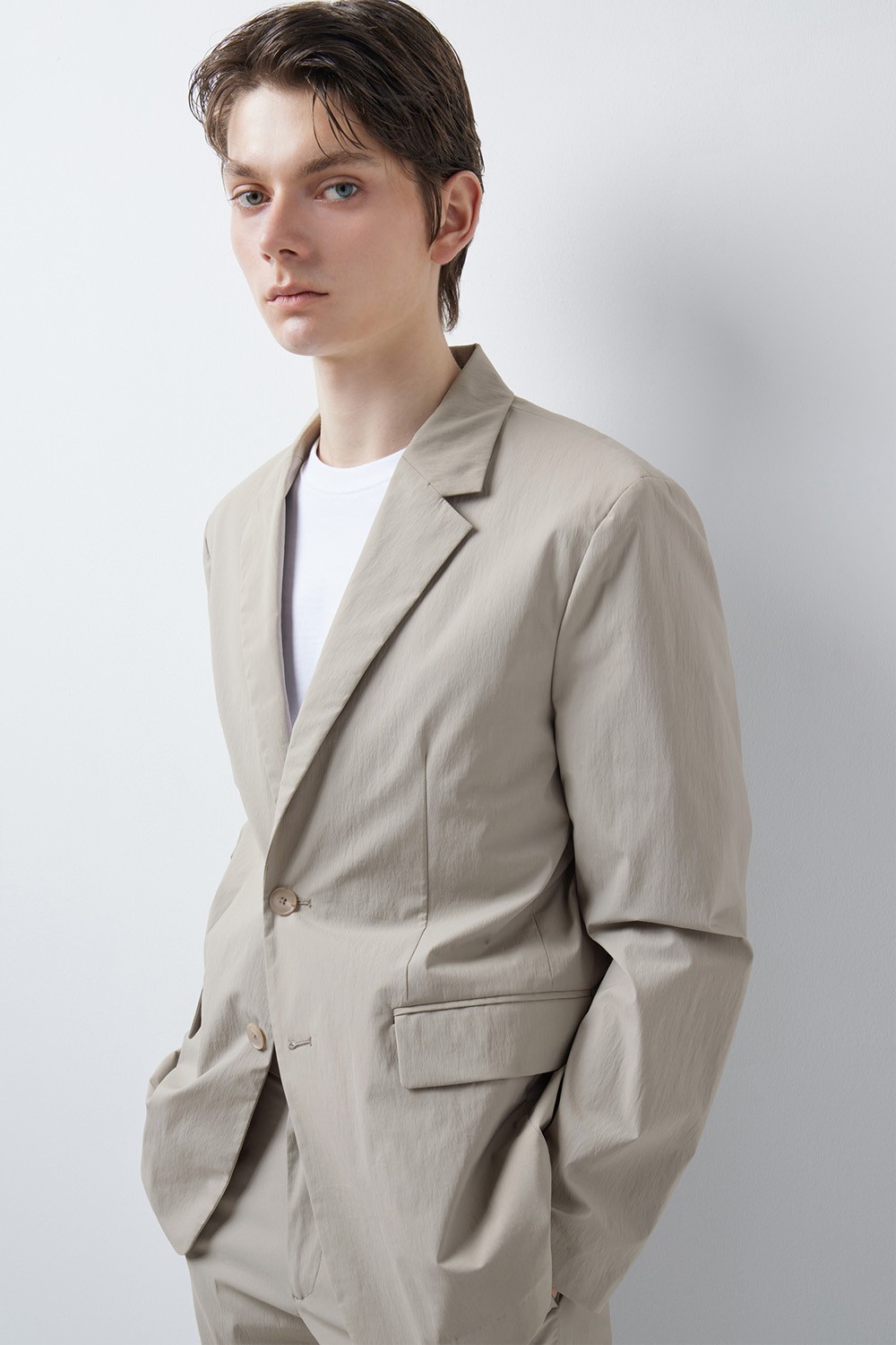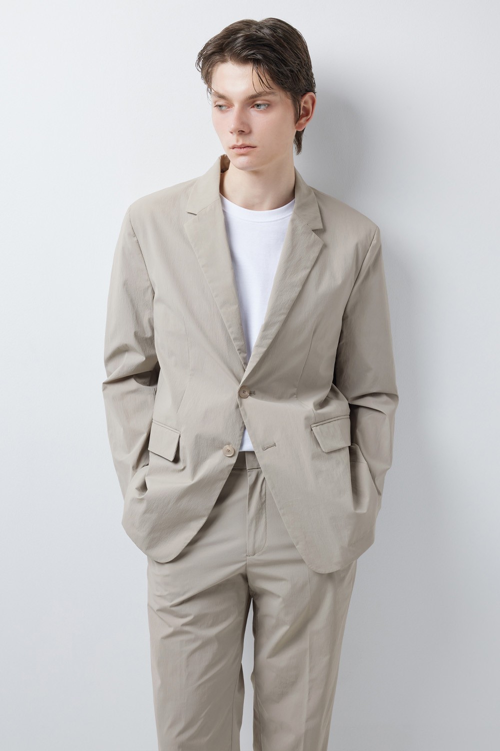 정돈된 실루엣과 유연한 소재감의 조화에 집중한 셋업 자켓입니다.