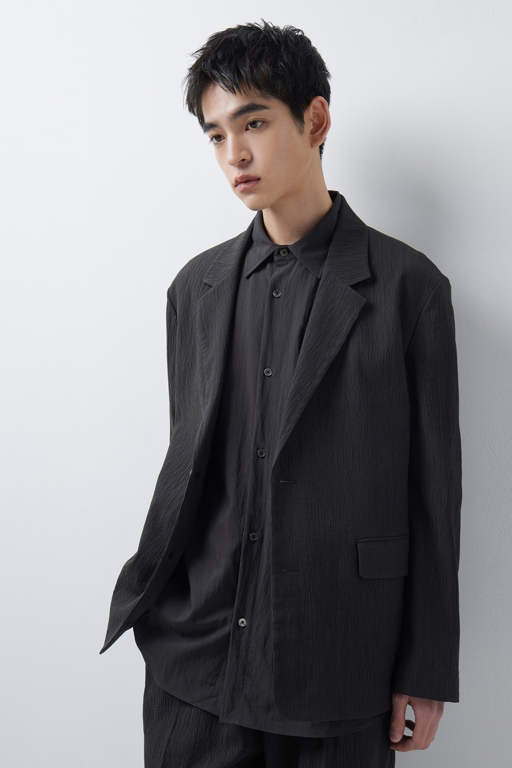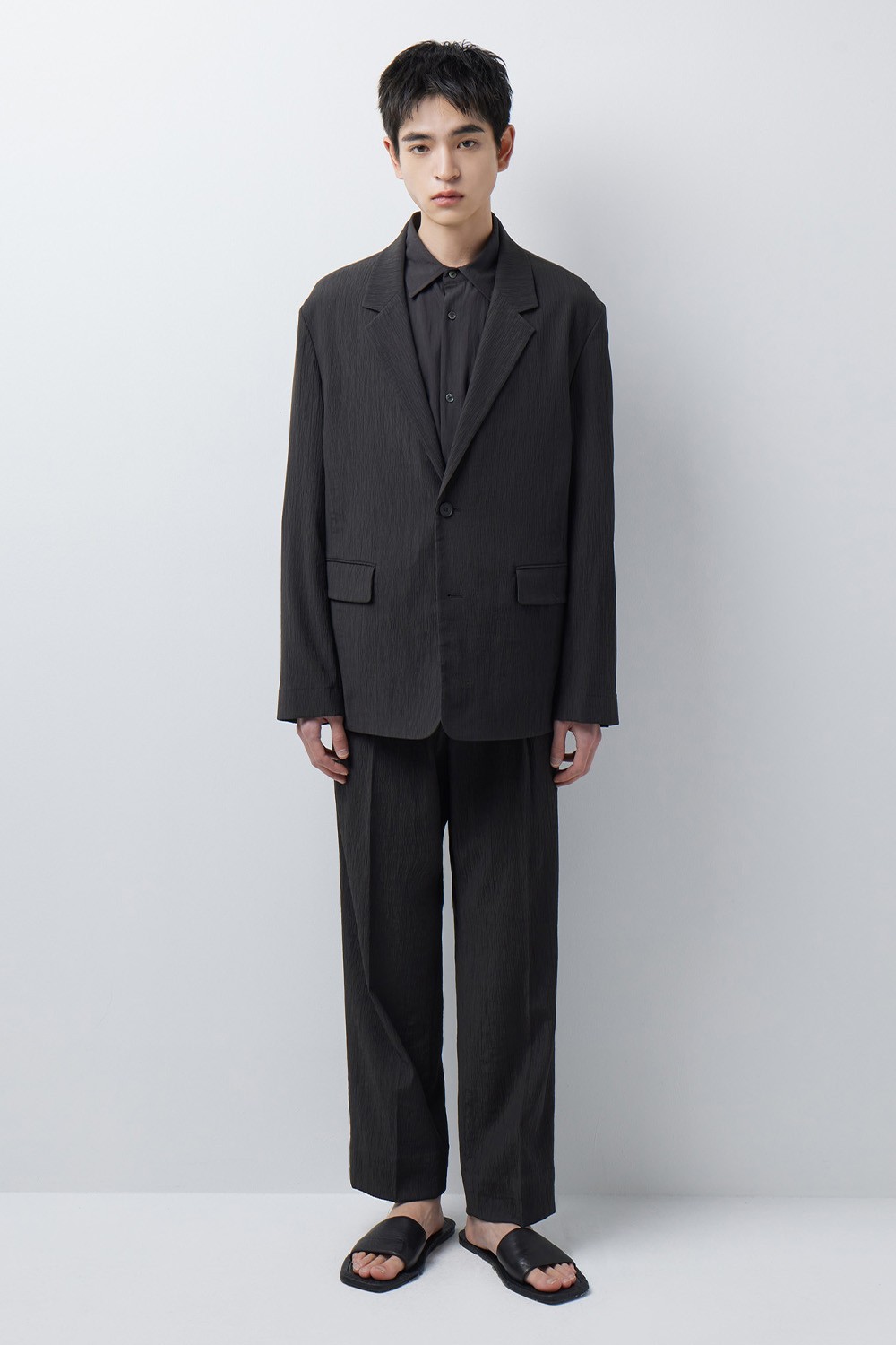 특수 열가공을 거친 모노사 소재를 사용하여 자연스러운 주름과 탄탄한 고시감을 구현했습니다. 우수한 스트레치성과 쾌적한 터치감을 제공하며, 구김에 강하고 관리가 용이해 일상 속에서 보다 편안하게 착용할 수 있는 아이템입니다.