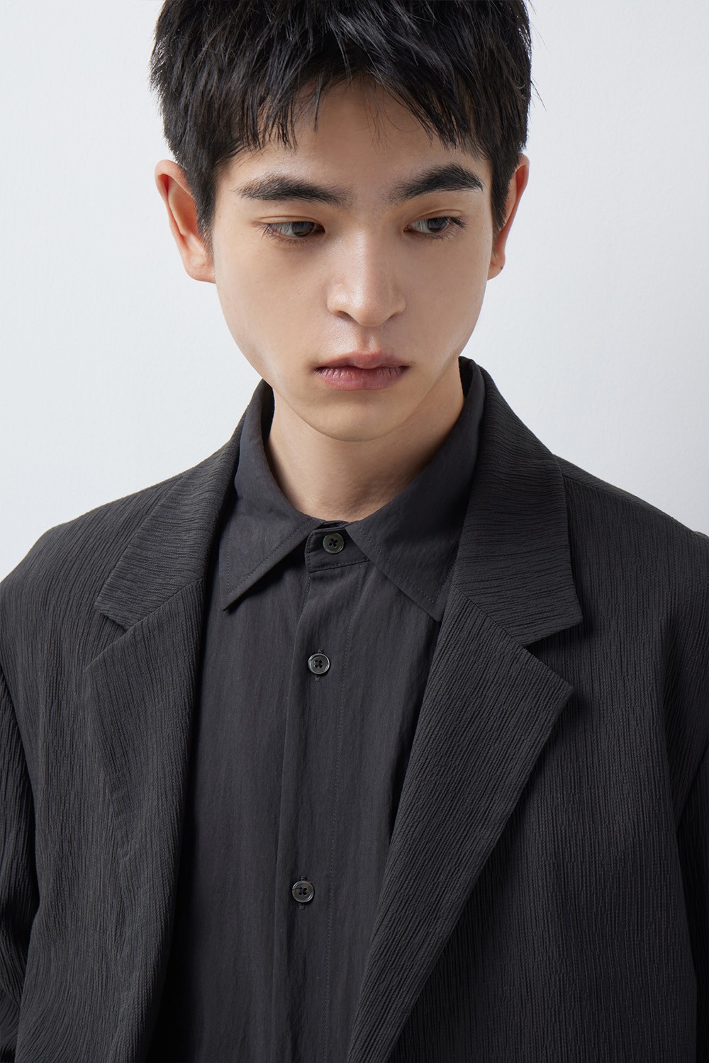 A : 어깨 패드나 무거운 심지를 최소화하여 원단 본연의 가벼움을 살린 설계입니다. 자켓 특유의 정갈한 무드는 유지하면서도 착용감이 한층 유연하고 가벼워 더운 날씨에도 쾌적하게 활용하기 좋습니다.