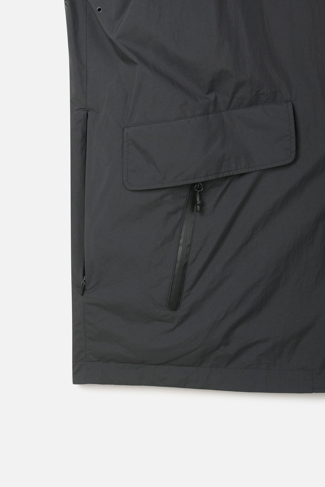 셋업 자켓의 단정한 실루엣과 구조를 갖추고 있지만, 총 7개의 포켓을 상황에 맞춰 배치해 수납성과 디자인 밸런스를 동시에 고려했습니다. 전면 메인 포켓에는 방수 지퍼를 사용해 기기류나 귀중품 수납에 안전성을 더했으며, 등판 하단에는 트임 구조를 적용해 편안한 활동성을 제공합니다. 넥라인에 행거 루프와 함께 동봉되는 휴대용 파우치로 편리한 보관 또한 가능합니다.