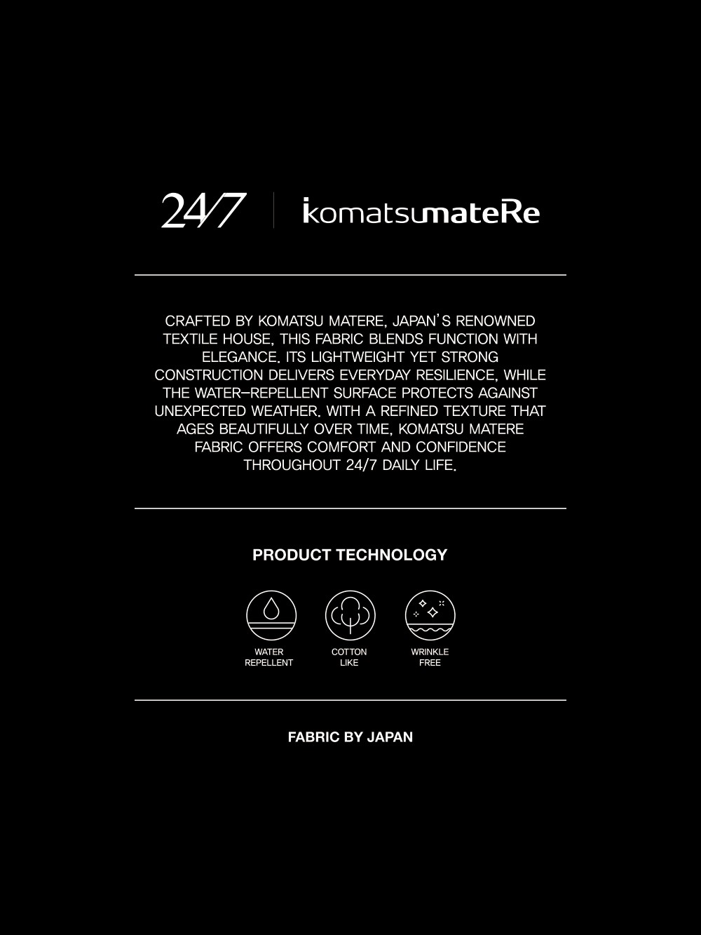 일본 KOMATSU社의 DANTOTSU HASSUI 원단을 사용했습니다. DANTOTSU Water Repellent® 가공은 원단 표면에서 물방울과의 접촉 면적을 최소화해, 물이 쉽게 맺히고 빠르게 흘러내리도록 설계되었습니다. 무광의 절제된 광택과 구조적인 텍스처로 일상적인 비와 생활 오염에 효과적으로 대응하며, 쾌적한 착용 환경을 유지하실 수 있습니다.