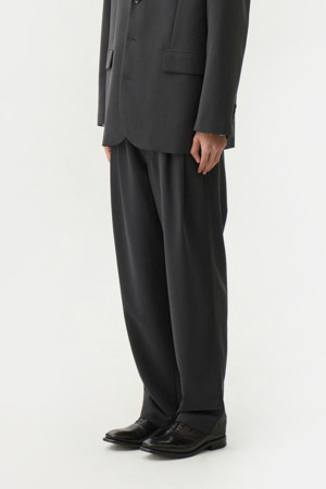 SINGLE BREASTED 3 BUTTON JACKET과 셋업으로 착용할 수 있는 PLEATED SIDE ADJUSTER PANTS입니다.