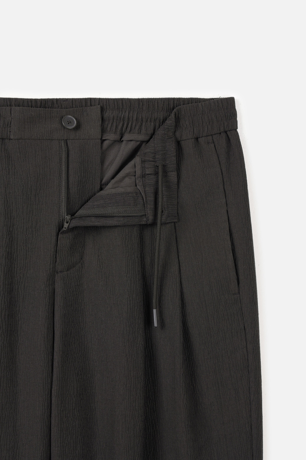 A : 시어서커와 유사한 시원한 질감과 적절한 두께감으로 간절기부터 한여름까지 전천후로 활용 가능합니다. 더블 플리츠 디자인 덕분에 티셔츠나 셔츠를 넣어 입는 턱인 스타일로 연출했을 때 더욱 세련된 무드를 선사합니다.