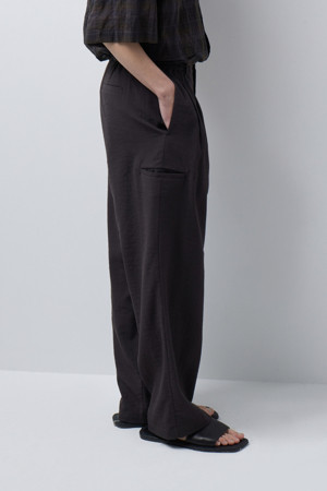 편안한 착용감을 고려해 허리 전체에 밴딩을 적용했으며, 허리라인 안쪽에는 드로우 스트링을 더해 체형에 맞게 사이즈를 조절하실 수 있도록 제작했습니다. 앞판에는 투턱 디테일을 적용해 자연스러운 볼륨감과 여유 있는 와이드 실루엣을 연출합니다.
