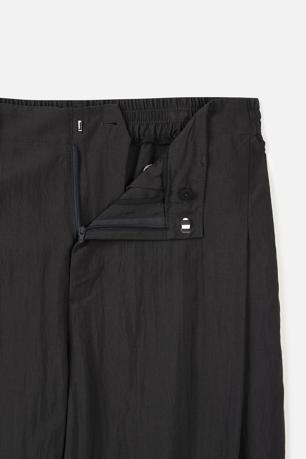 허리에는 단추 여밈과 뒤 허리 밴딩을 함께 적용해 착용과 탈착이 편리하면서도 안정적인 착용감을 느끼실 수 있도록 구성했습니다. 1턱 디테일을 더해 착용 시 자연스러운 여유를 확보했으며, 전체적인 실루엣은 셋업 팬츠로서 단정함을 유지하도록 조율했습니다.