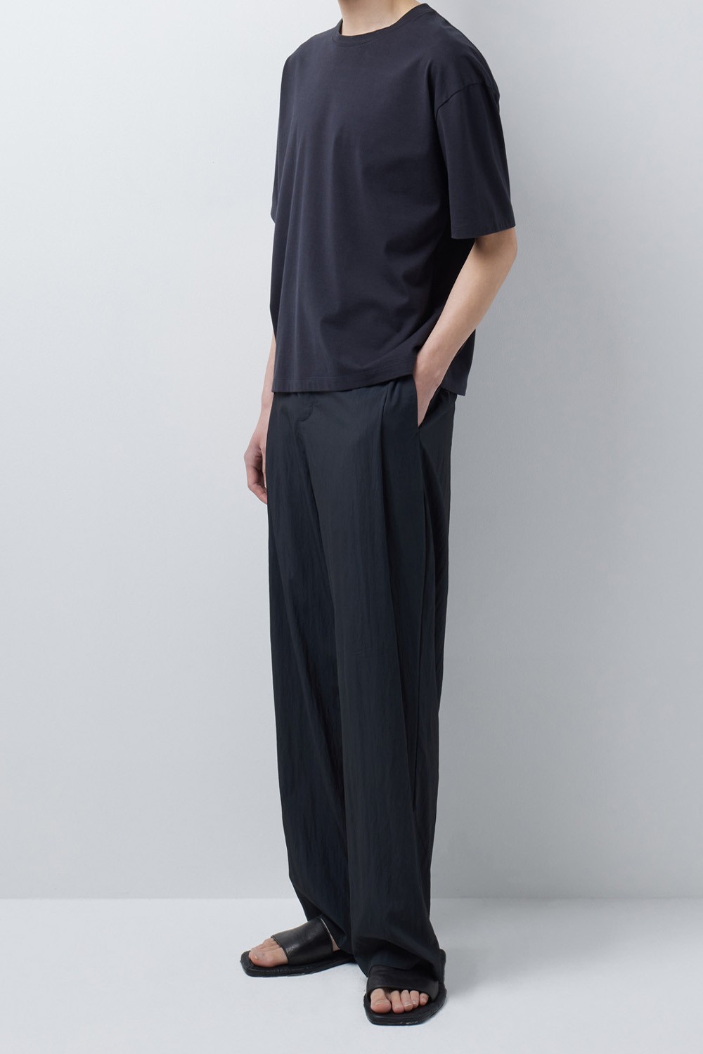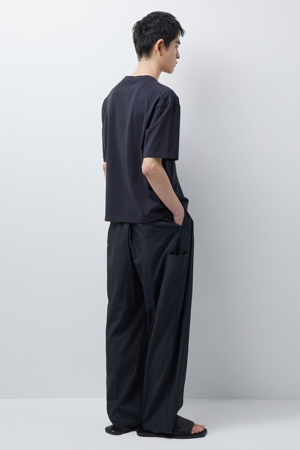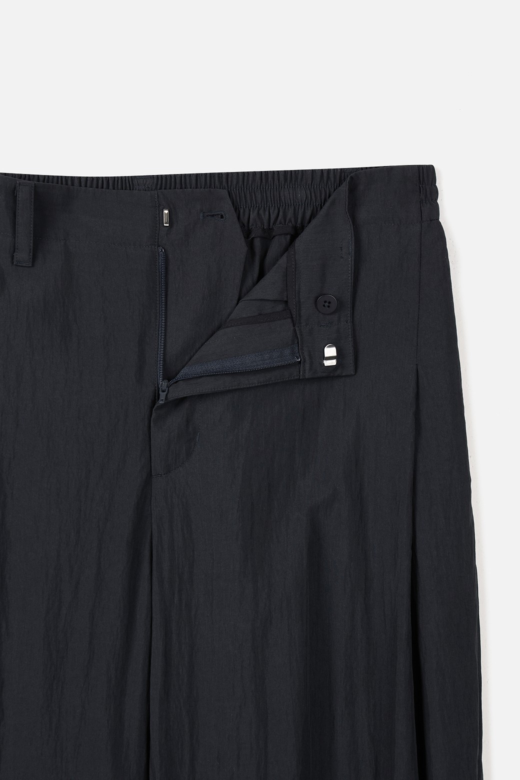 허리에는 단추 여밈과 뒤 허리 밴딩을 함께 적용해 착용과 탈착이 편리하면서도 안정적인 착용감을 느끼실 수 있도록 구성했습니다. 1턱 디테일을 더해 착용 시 자연스러운 여유를 확보했으며, 전체적인 실루엣은 셋업 팬츠로서 단정함을 유지하도록 조율했습니다.