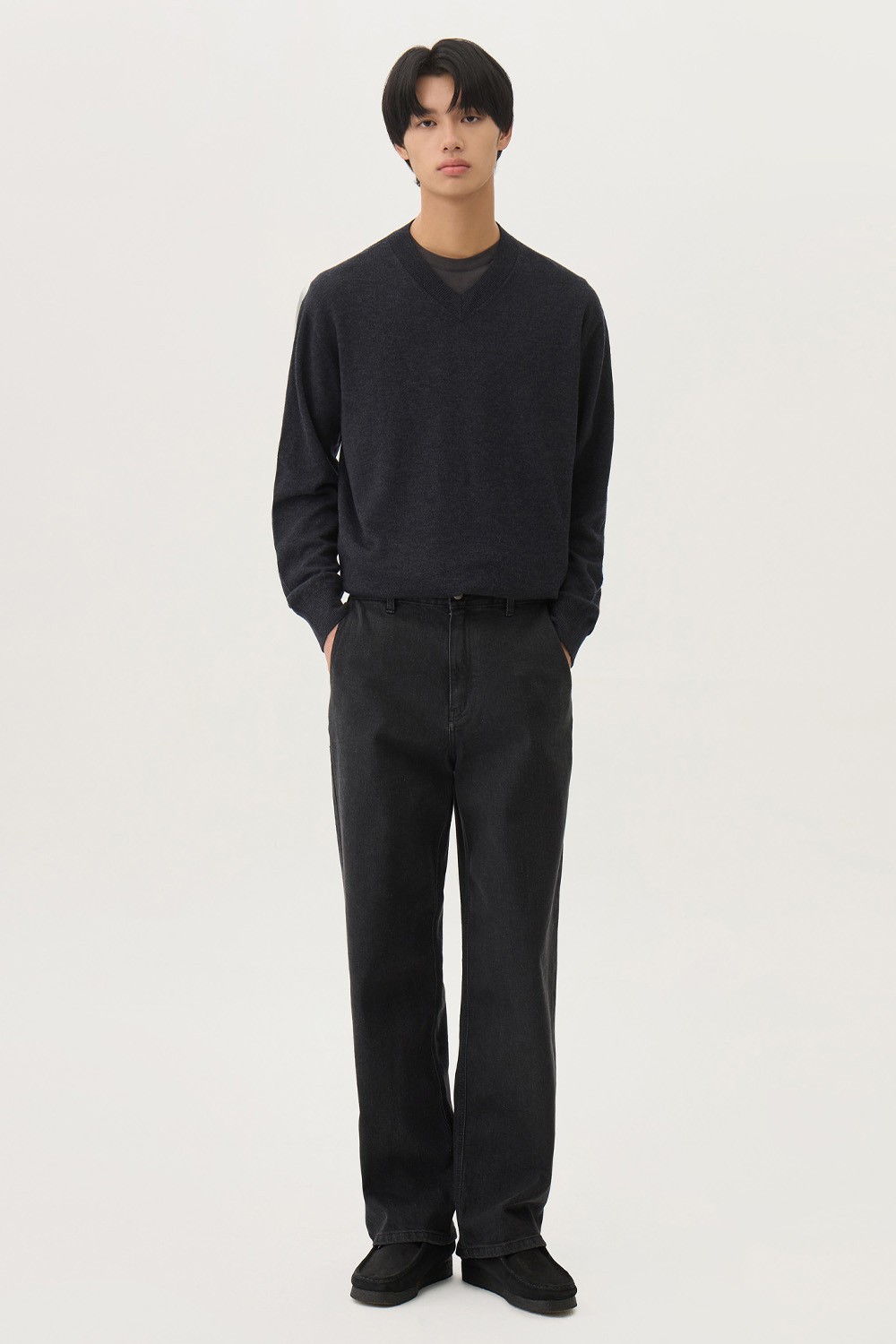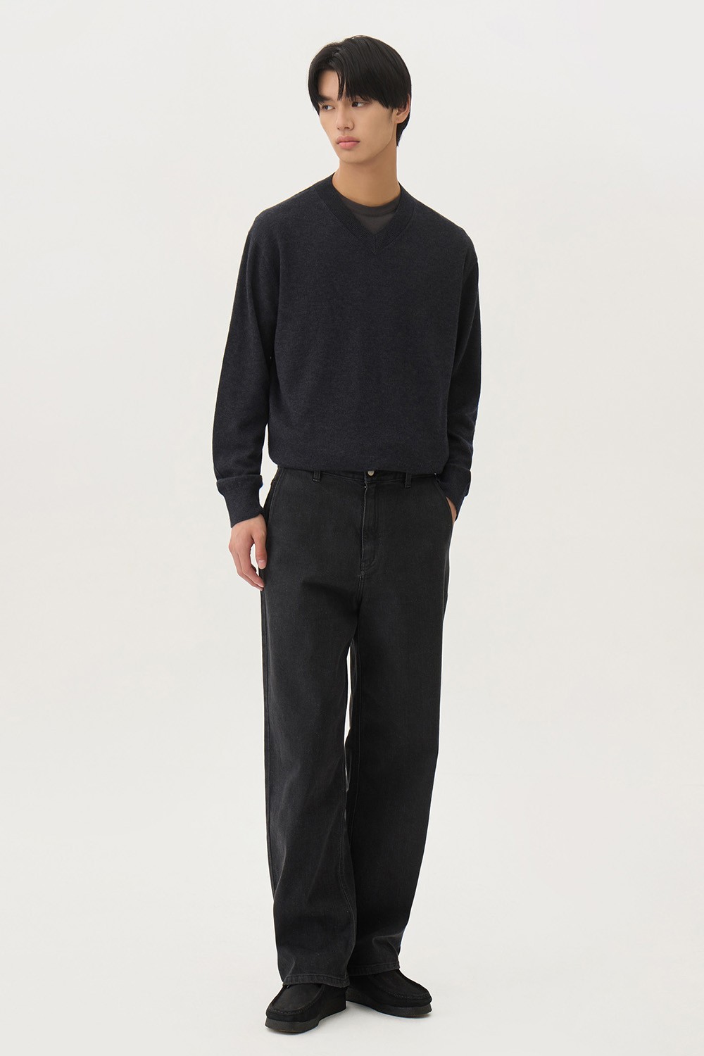 A : 미니멀한 티셔츠 하나만으로도 충분히 완성도 있는 실루엣을 보여줍니다. 스니커즈부터 로퍼까지 다양한 슈즈와 조화롭게 어우러지도록 설계되어 폭폭넓은 스타일링 범용성을 자랑합니다.