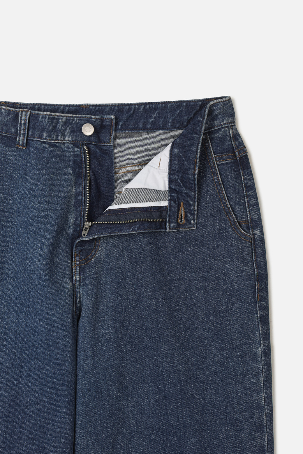 포켓 디자인은 치노 팬츠의 실용성에서 아이디어를 얻었습니다. J자 형으로 설계된 사이드 포켓은 손을 넣을 때 보다 자연스럽고 편안한 각도를 선사하며 데님에서 흔치 않은 담백한 외관을 완성합니다.