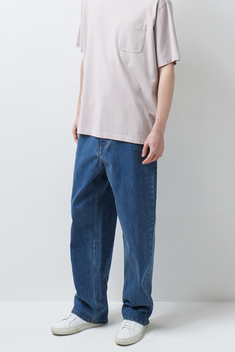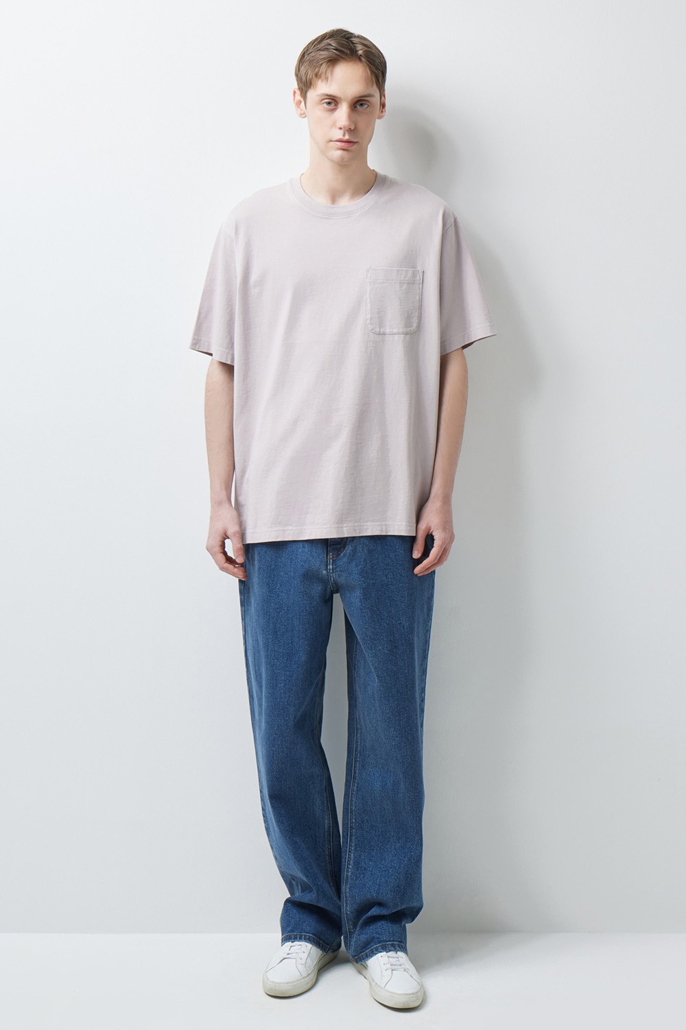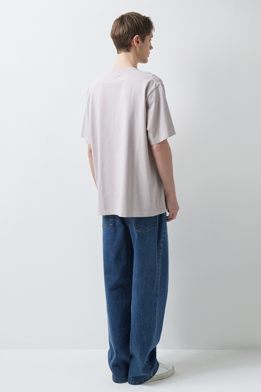 A : 미니멀한 티셔츠 하나만으로도 충분히 완성도 있는 실루엣을 보여줍니다. 스니커즈부터 로퍼까지 다양한 슈즈와 조화롭게 어우러지도록 설계되어 폭넓은 스타일링 범용성을 자랑합니다.
