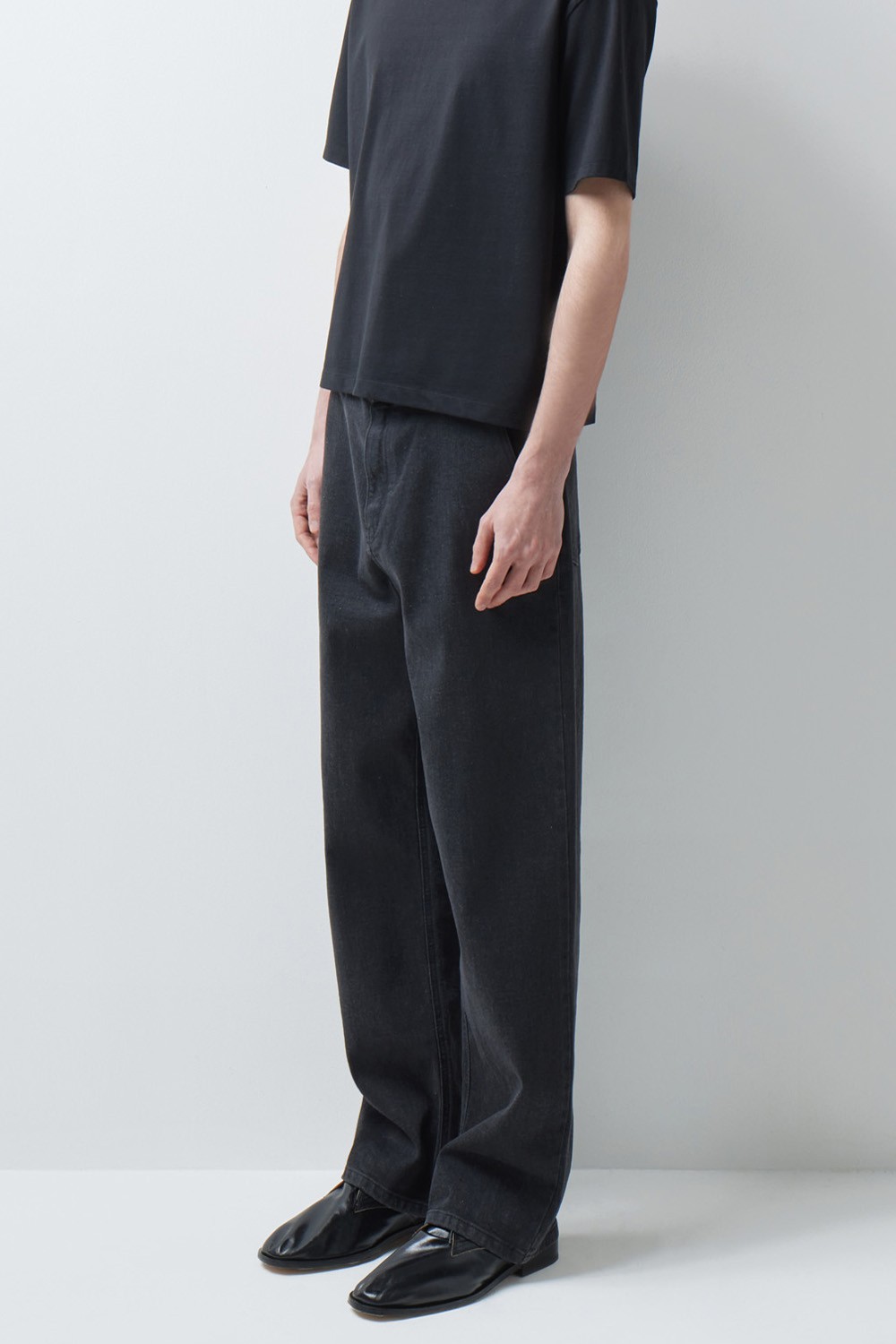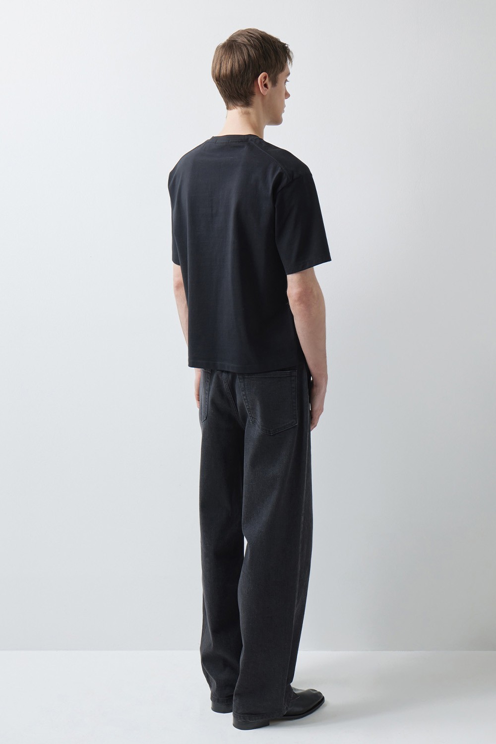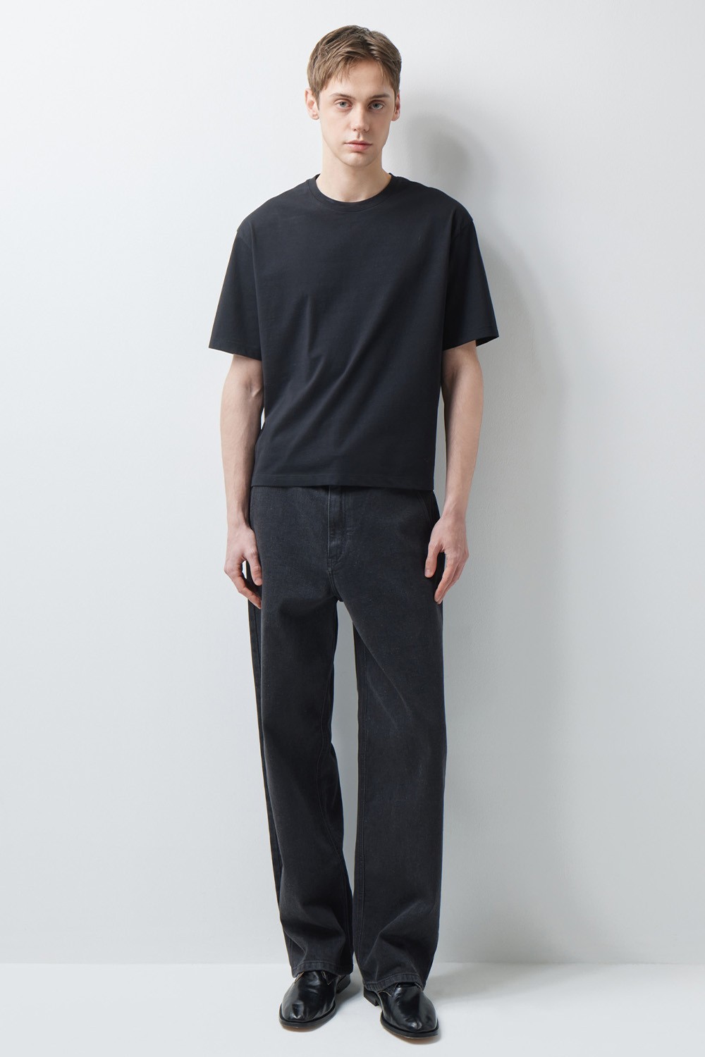 A : 미니멀한 티셔츠 하나만으로도 충분히 완성도 있는 실루엣을 보여줍니다. 스니커즈부터 로퍼까지 다양한 슈즈와 조화롭게 어우러지도록 설계되어 폭넓은 스타일링 범용성을 자랑합니다.