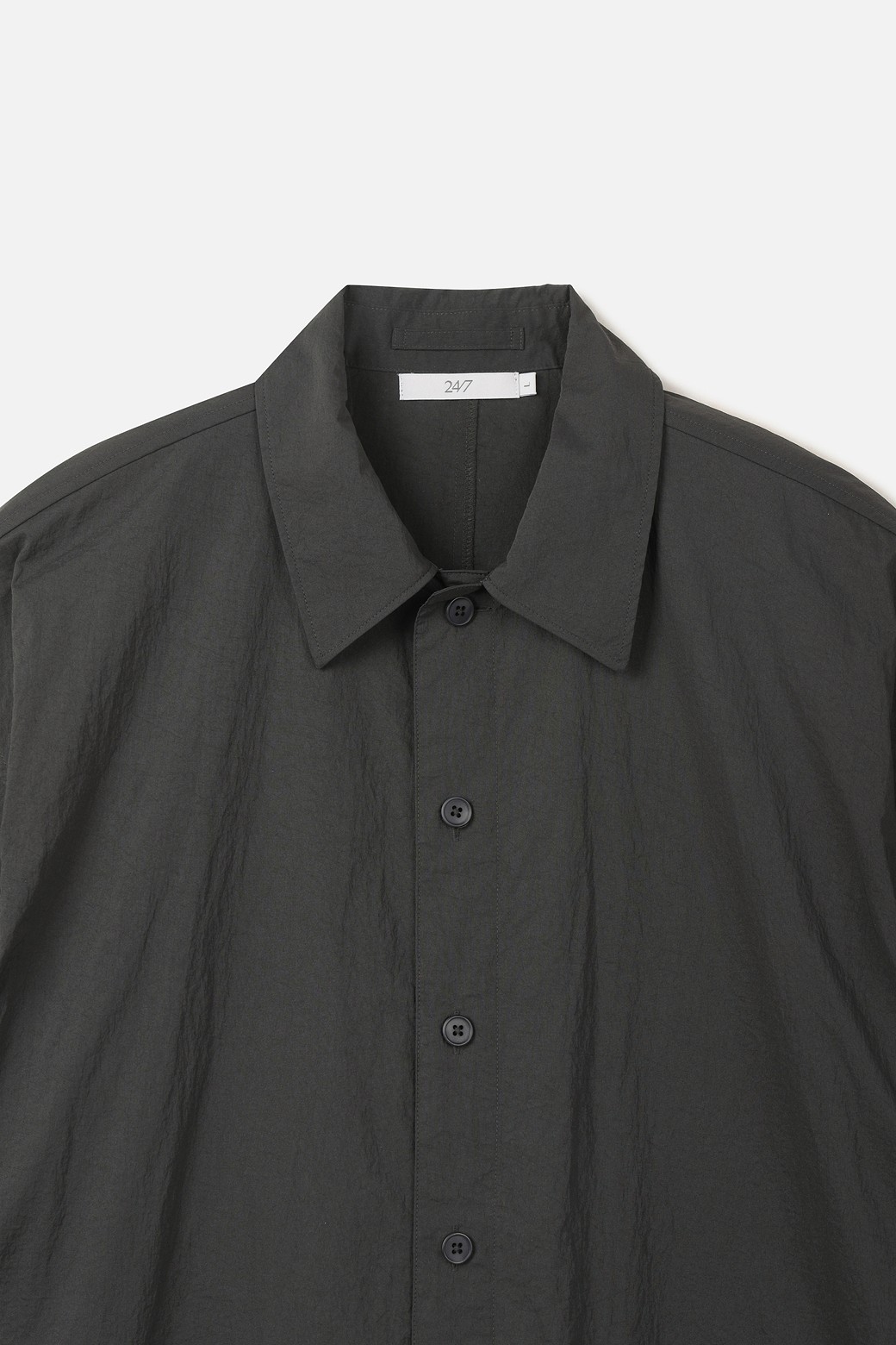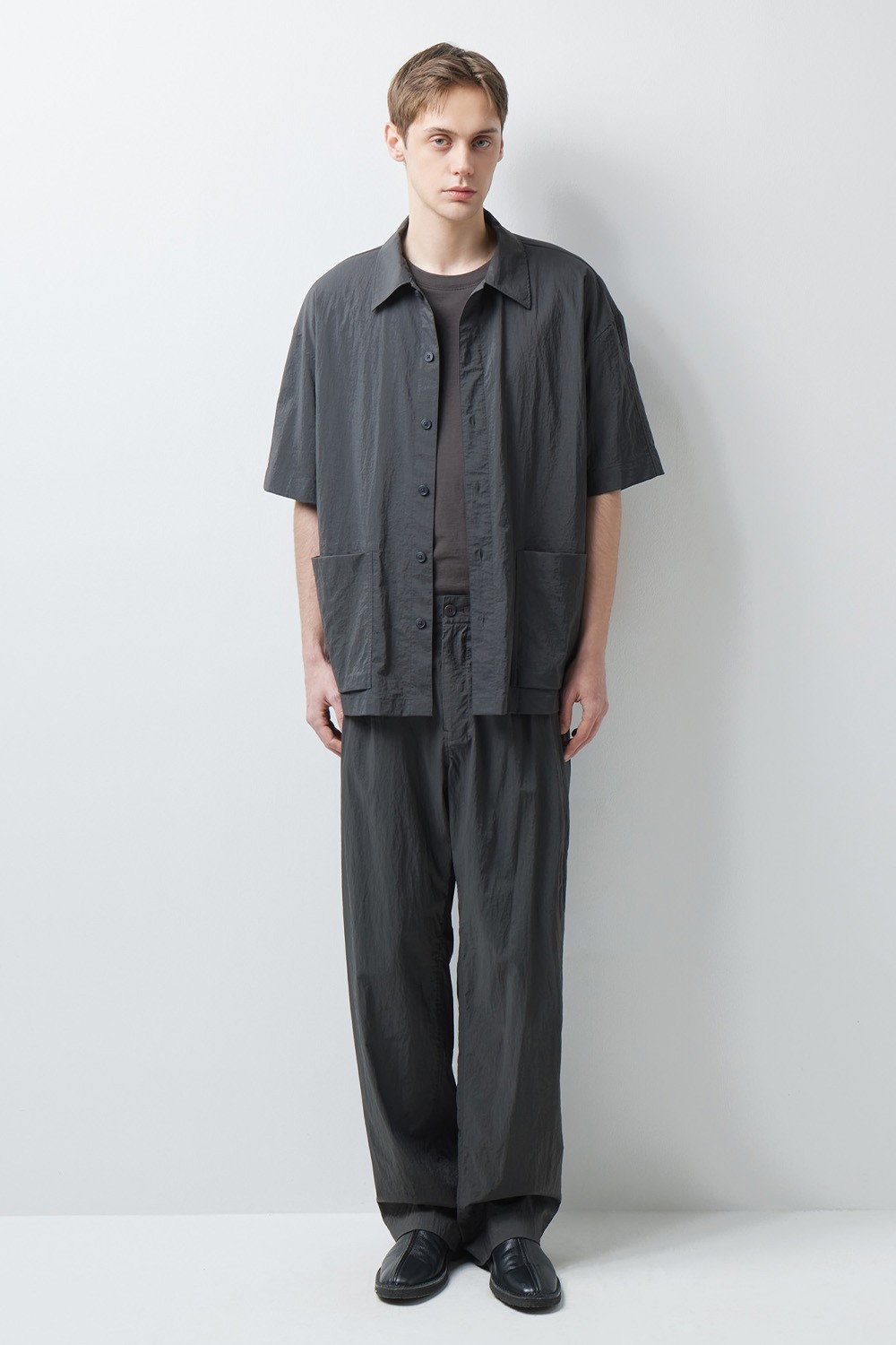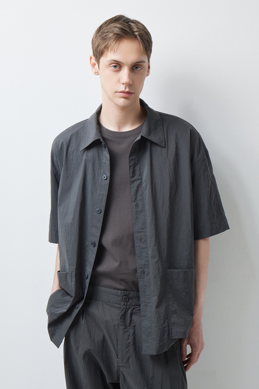 A :셔츠의 정갈함과 자켓의 견고함을 결합한 아이템입니다. 단독으로 입으면 셔츠처럼 연출되지만, 여유 있는 오버핏으로 설계되어 티셔츠 위에 가볍게 걸치는 아우터로도 훌륭한 밸런스를 보여줍니다.