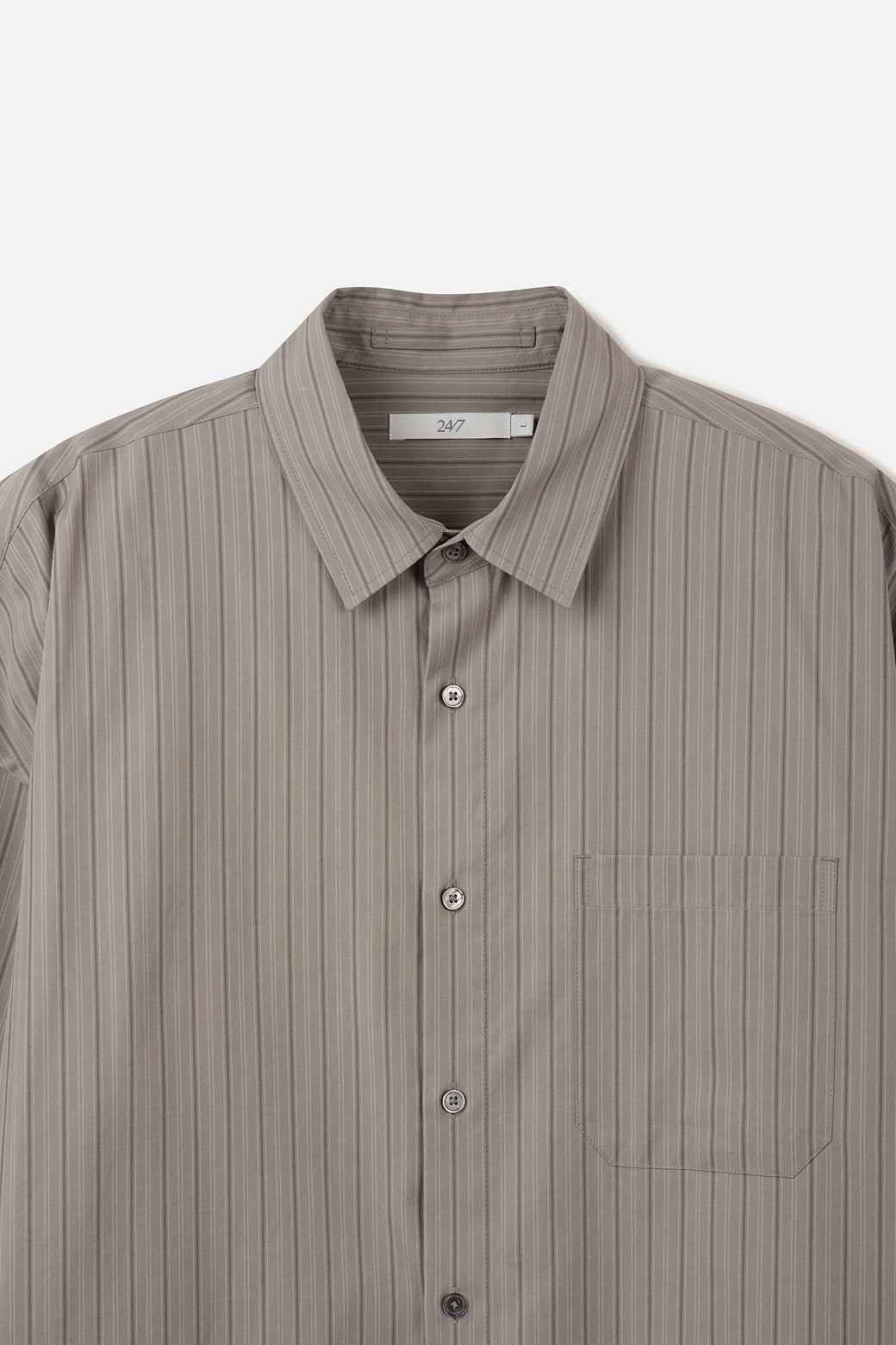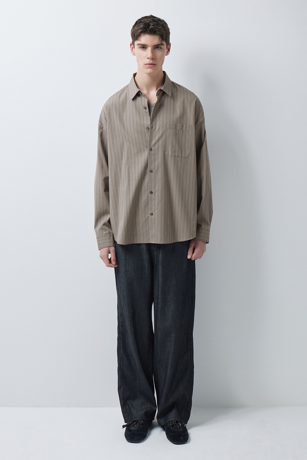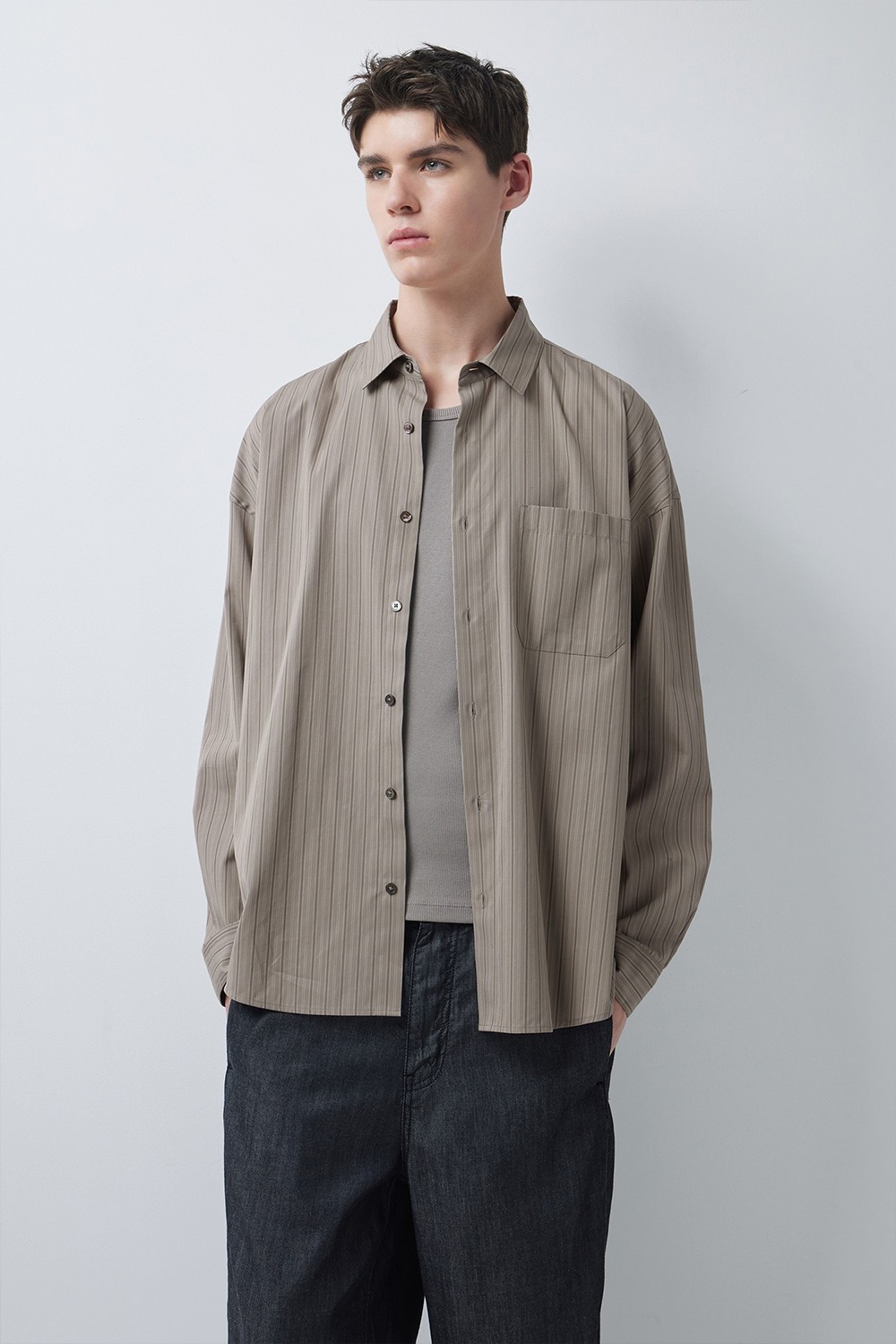 하늘한 스트라이프 소재와 여유 있는 실루엣으로, 자연스럽고 부드러운 무드의 셔츠입니다.