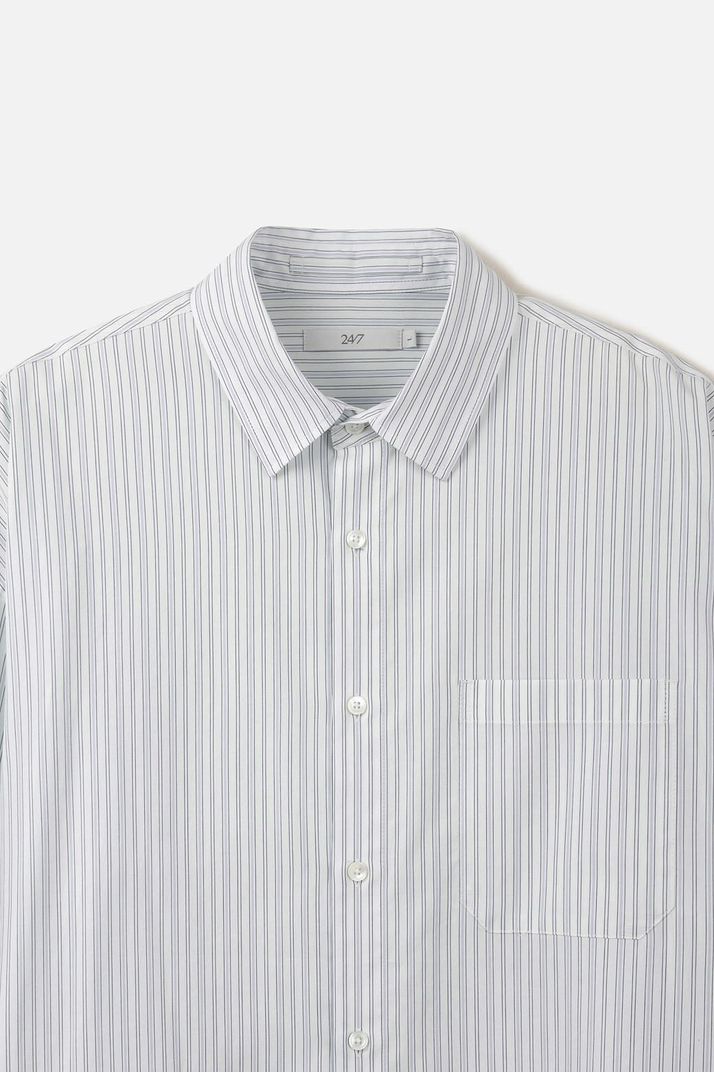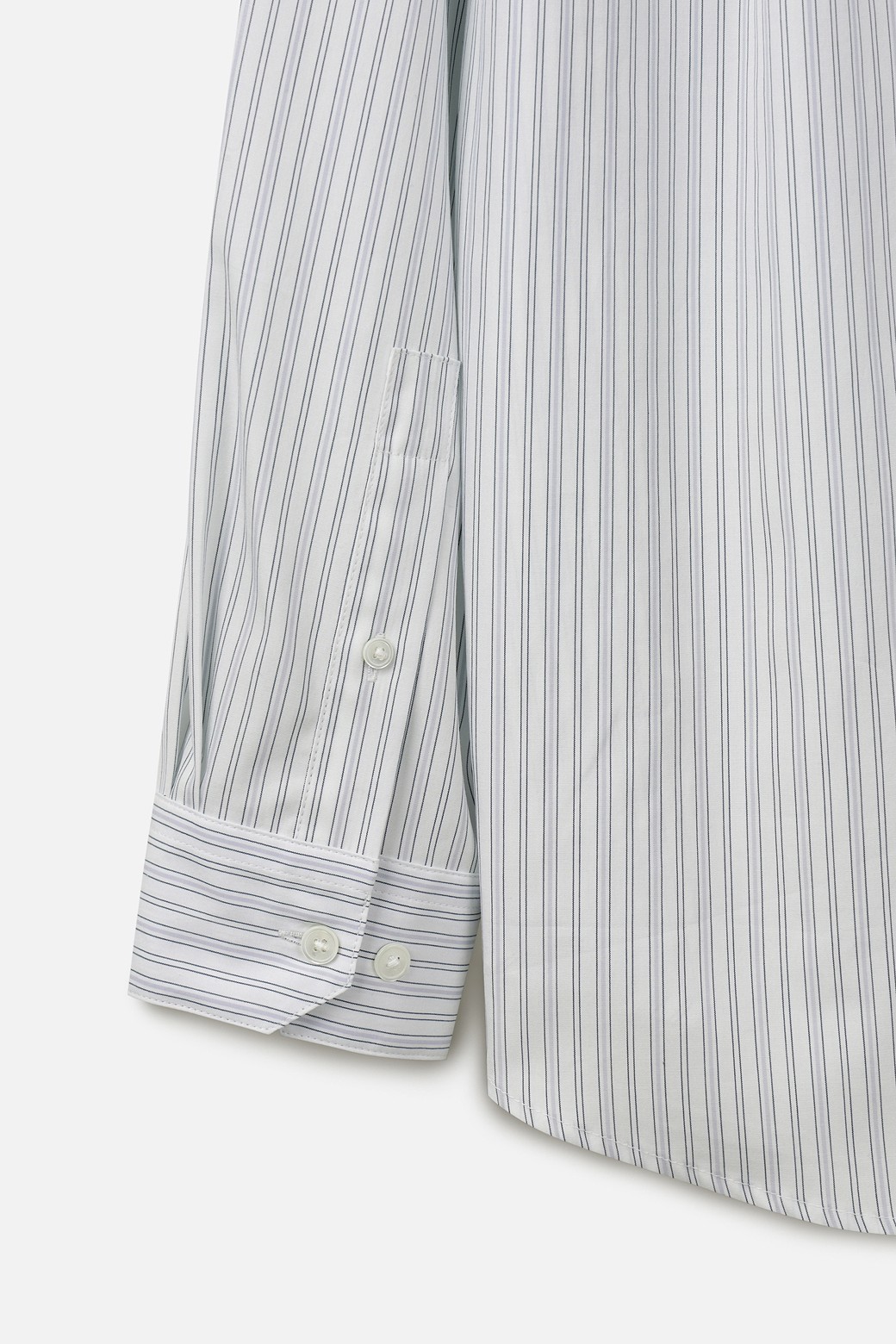 코튼 100% 원단을 사용했습니다. 60수 조직으로 가볍고 부드러운 터치감을 제공하며, 은은하게 하늘거리는 스트라이프 패턴이 특징입니다. 통기성이 우수해 더운 계절에도 쾌적한 착용감을 유지하실 수 있습니다.