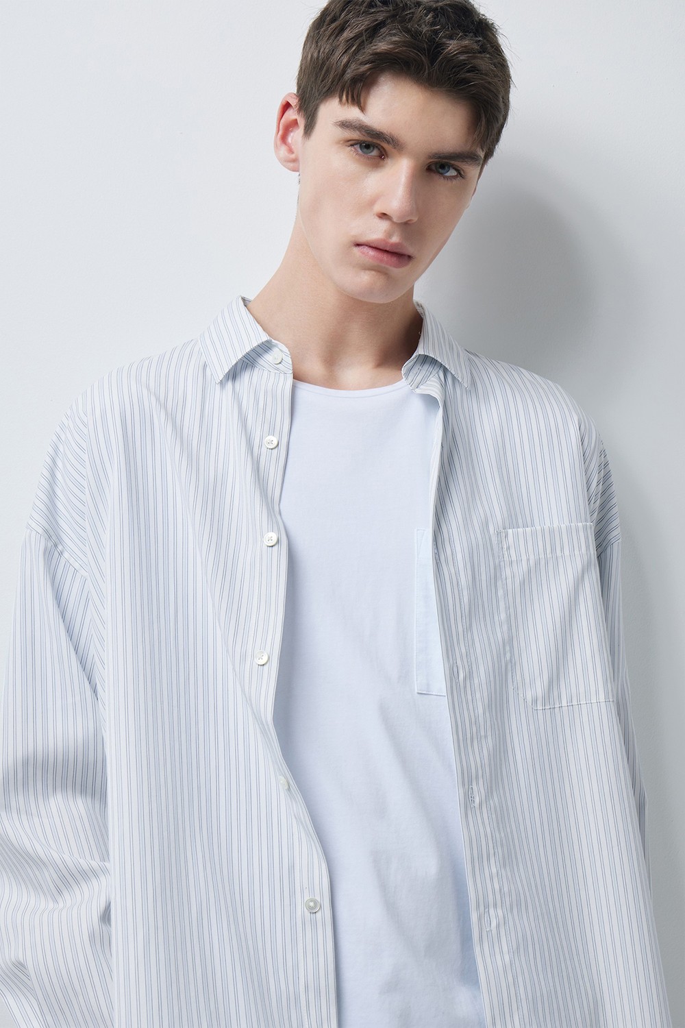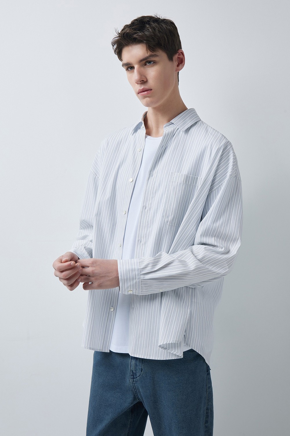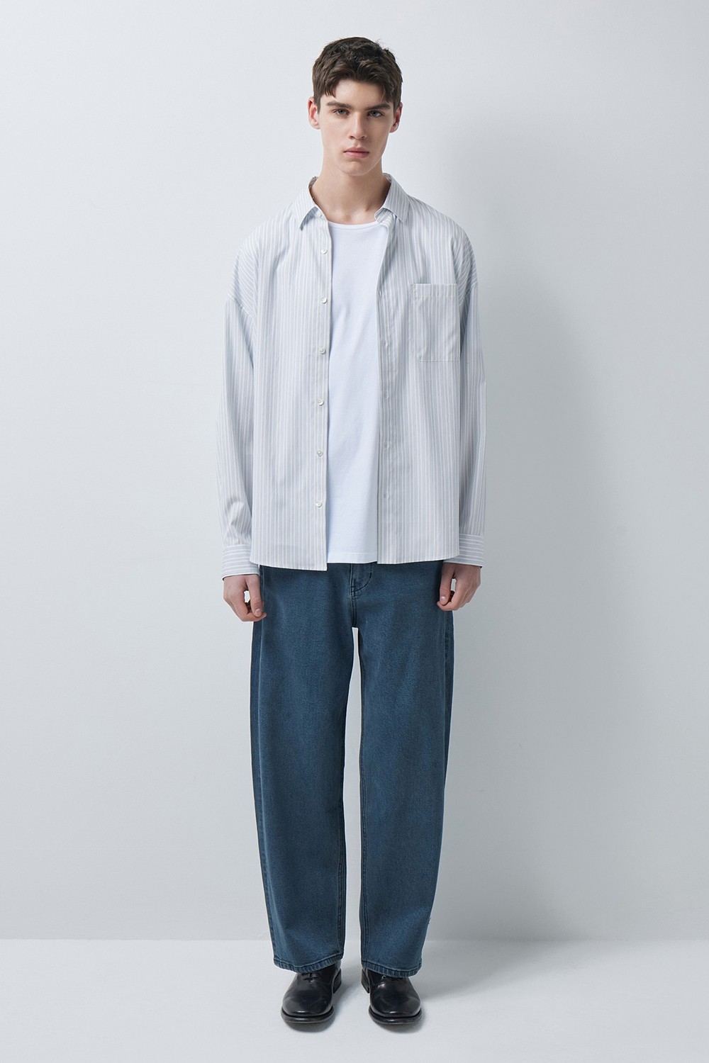 하늘한 스트라이프 소재와 여유 있는 실루엣으로, 자연스럽고 부드러운 무드의 셔츠입니다.