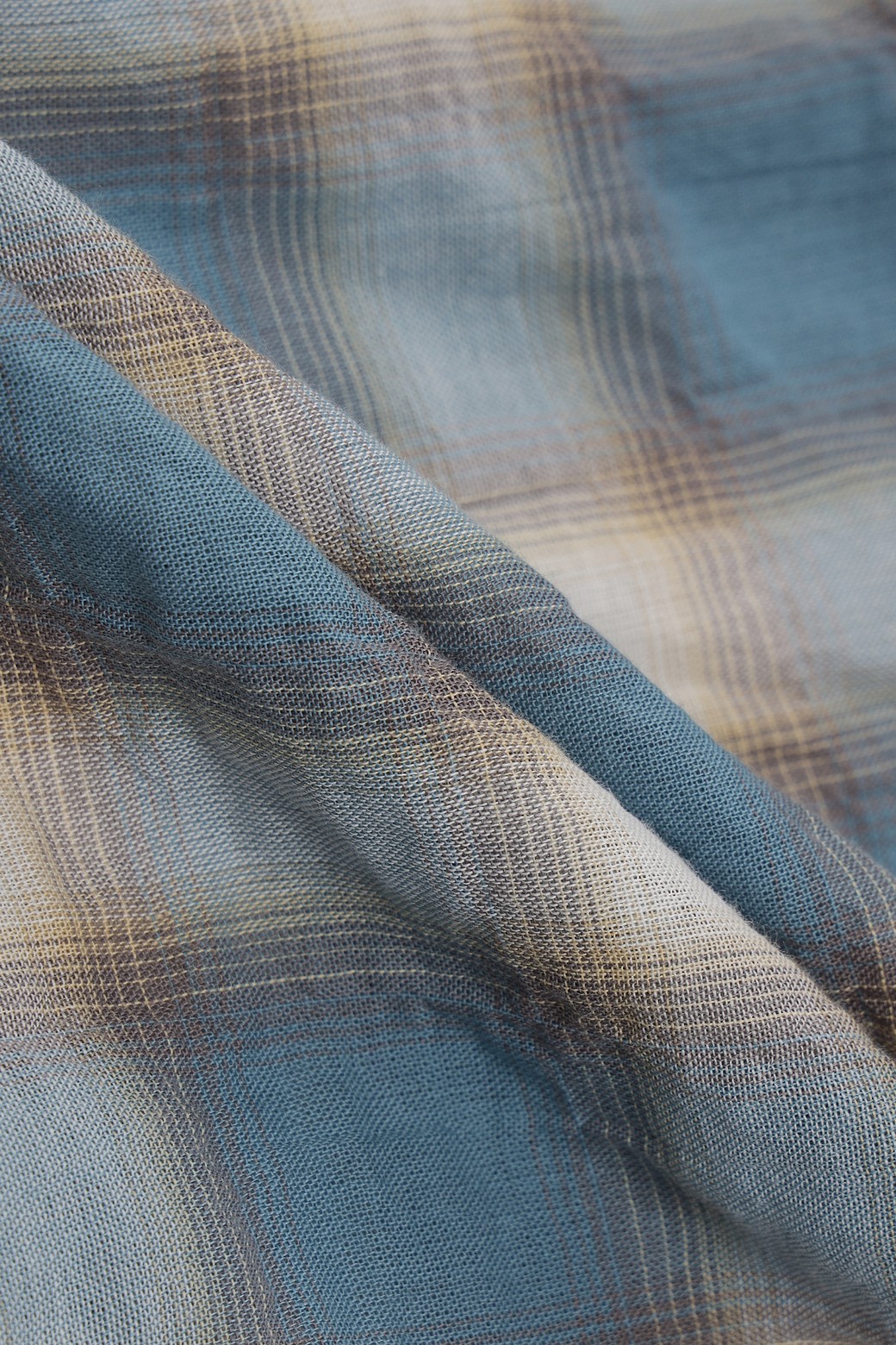 일본 WATANABEYA CO. LTD의 체크 원단을 사용했습니다. 코튼 99%와 폴리우레탄 1% 혼방으로 구성해 자연스러운 촉감과 함께 편안한 착용감을 제공합니다. 원단 특유의 자연스러운 구김 텍스처가 특징으로, 착용 시 더욱 멋스러운 분위기를 연출합니다.