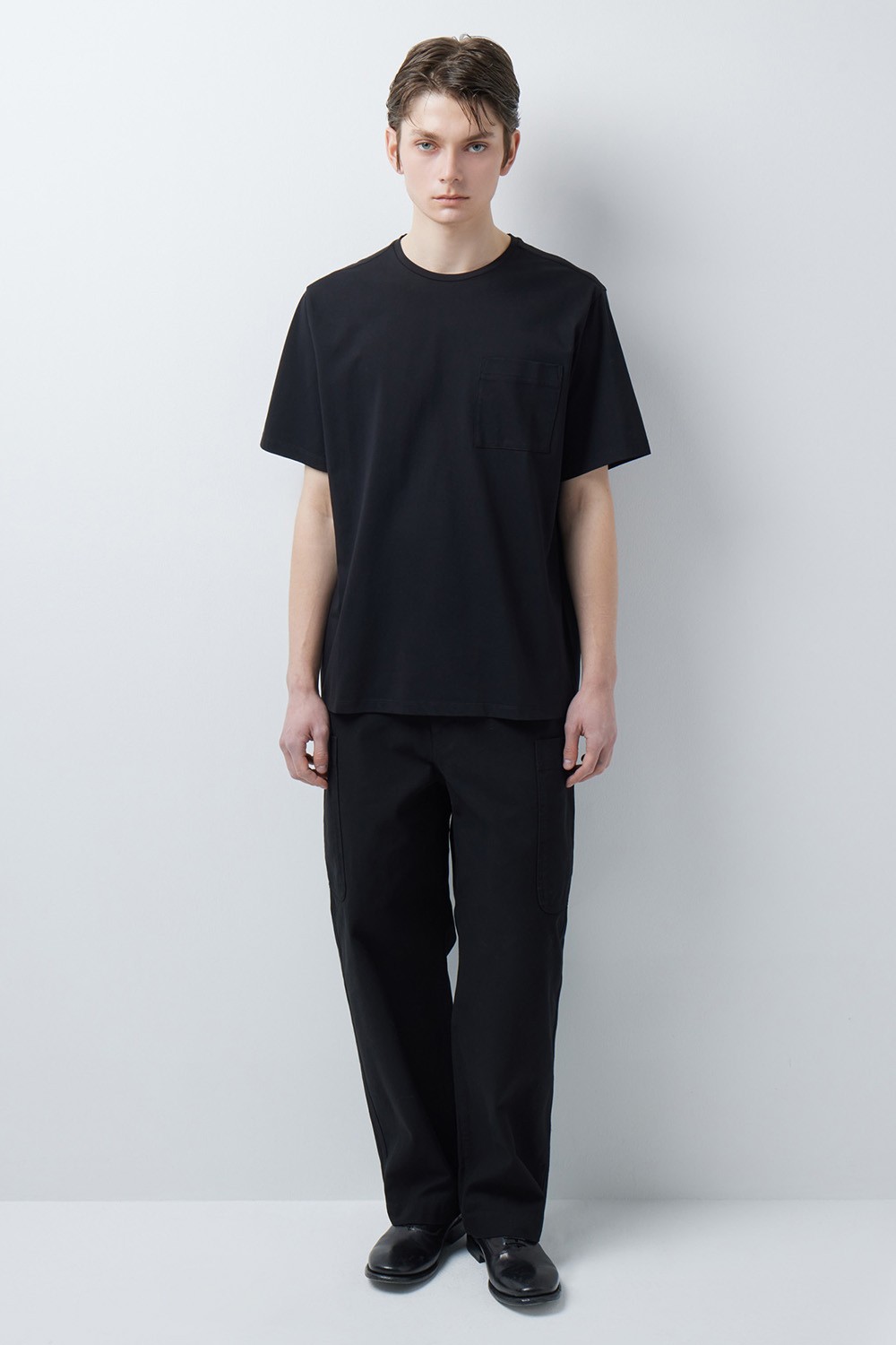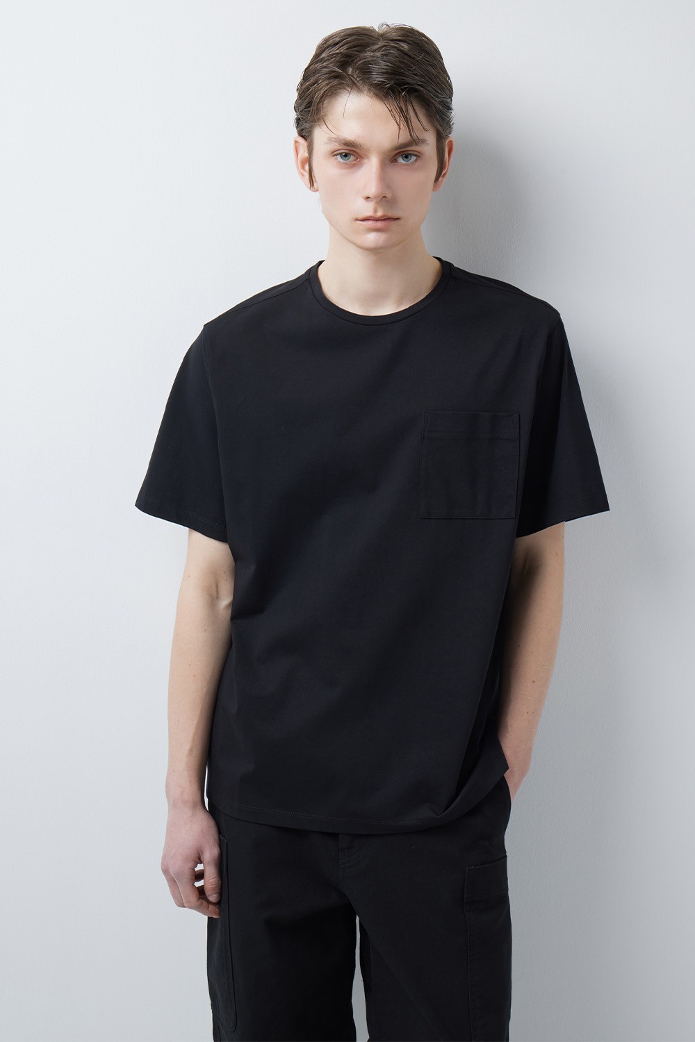 자연스럽게 떨어지는 세미오버핏 실루엣으로 설계되어 단정한 분위기를 연출합니다. 가슴 부분의 간결한 원 포켓 디테일이 시각적인 밸런스를 잡아주며, 단품 활용은 물론 아우터 안의 이너로서도 정돈된 아웃핏을 완성해주는 베이직 아이템입니다.