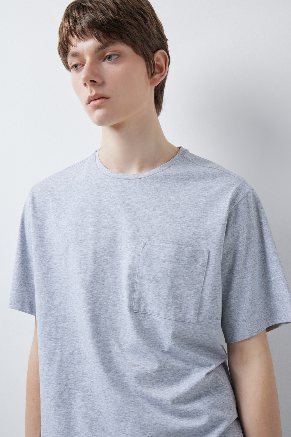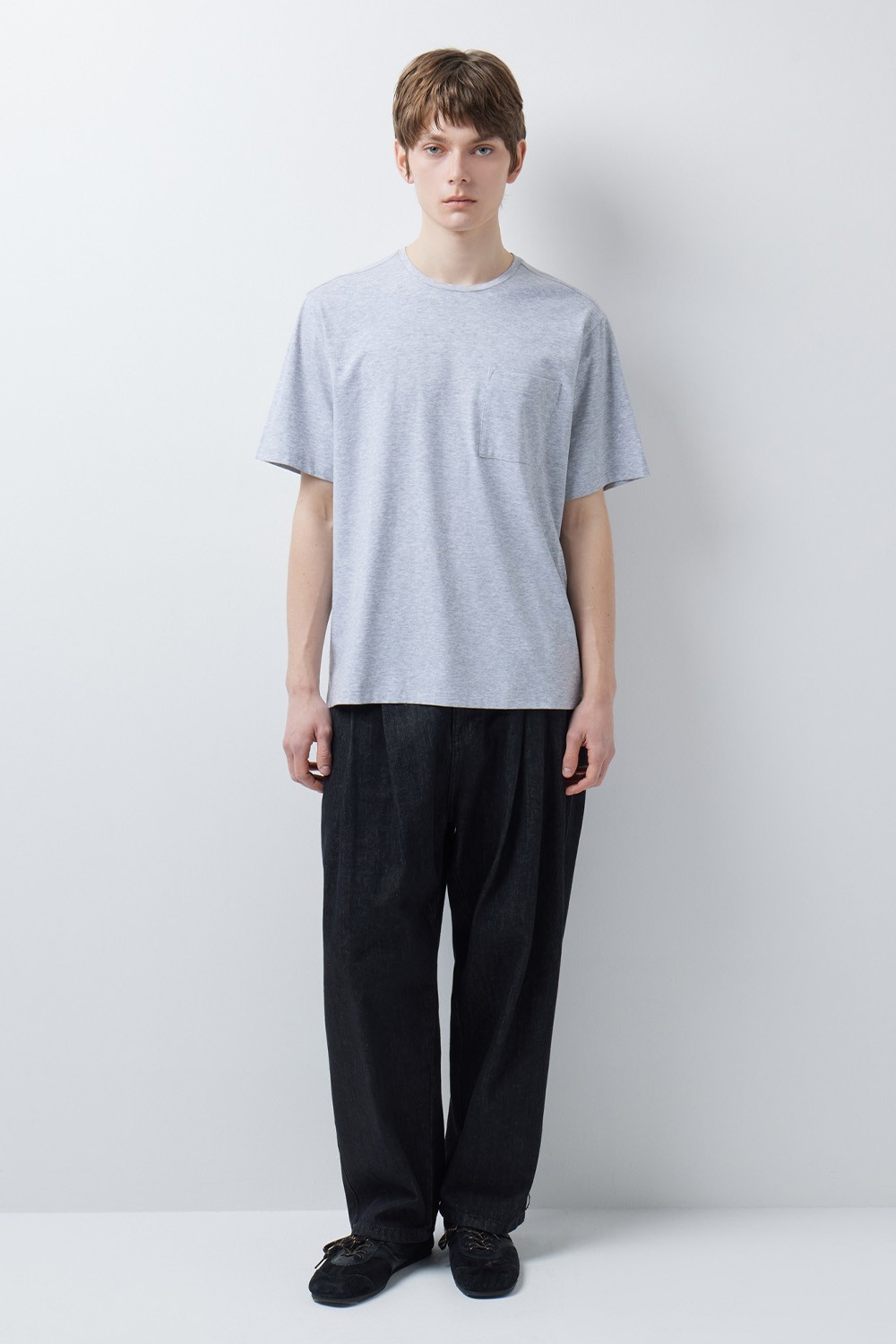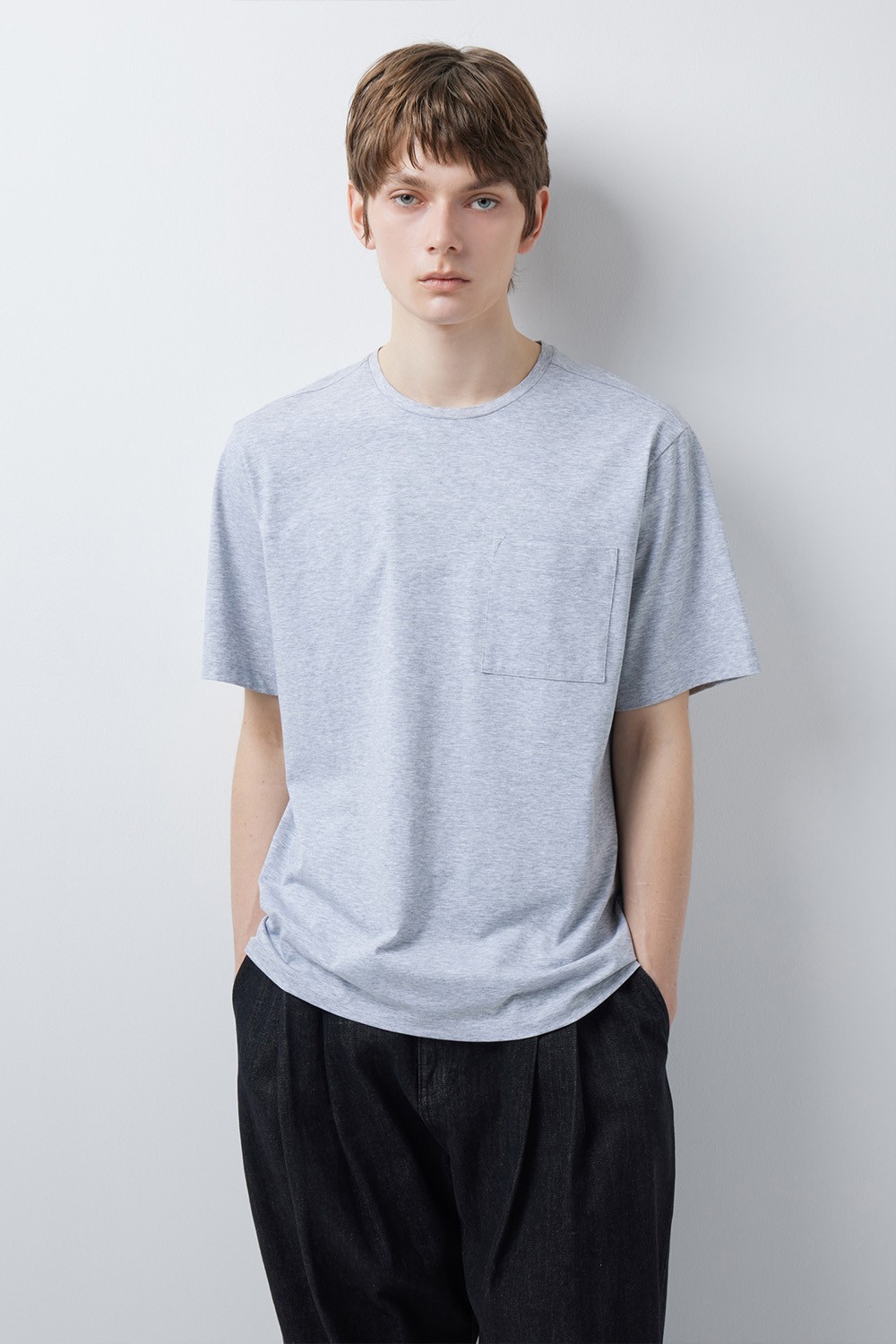 자연스럽게 떨어지는 세미오버핏 실루엣으로 설계되어 단정한 분위기를 연출합니다. 가슴 부분의 간결한 원 포켓 디테일이 시각적인 밸런스를 잡아주며, 단품 활용은 물론 아우터 안의 이너로서도 정돈된 아웃핏을 완성해주는 베이직 아이템입니다.