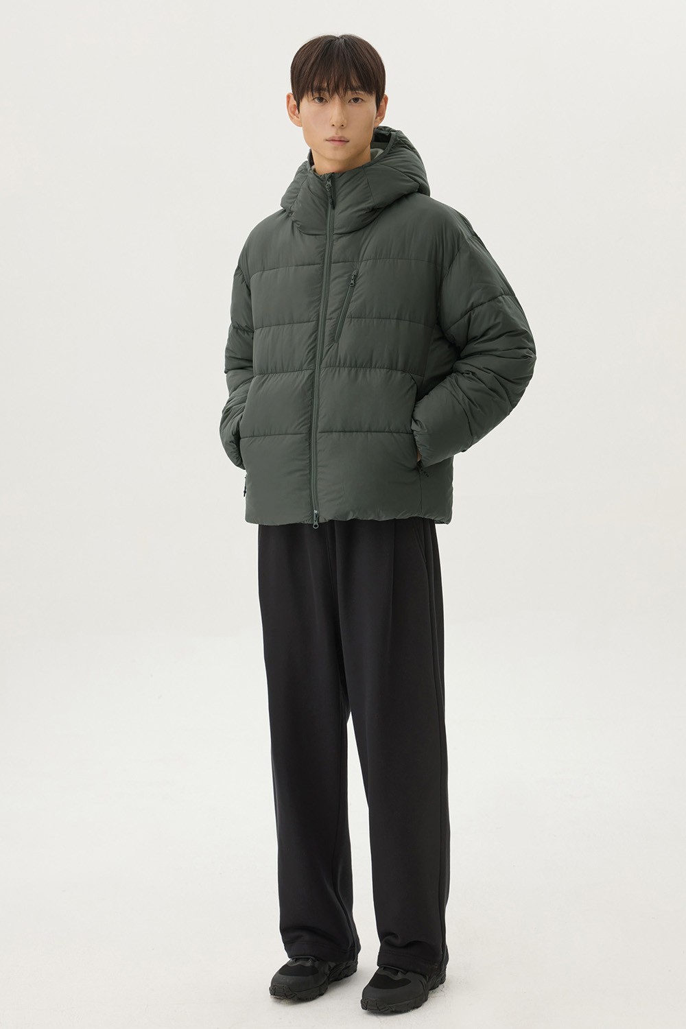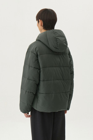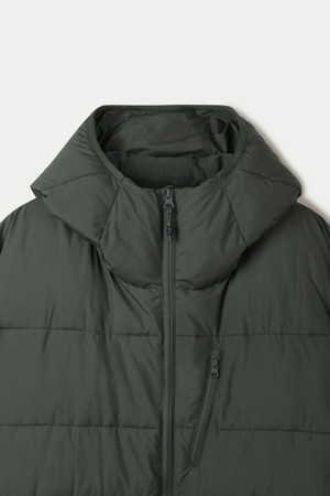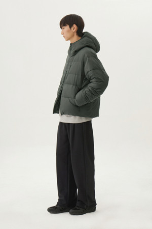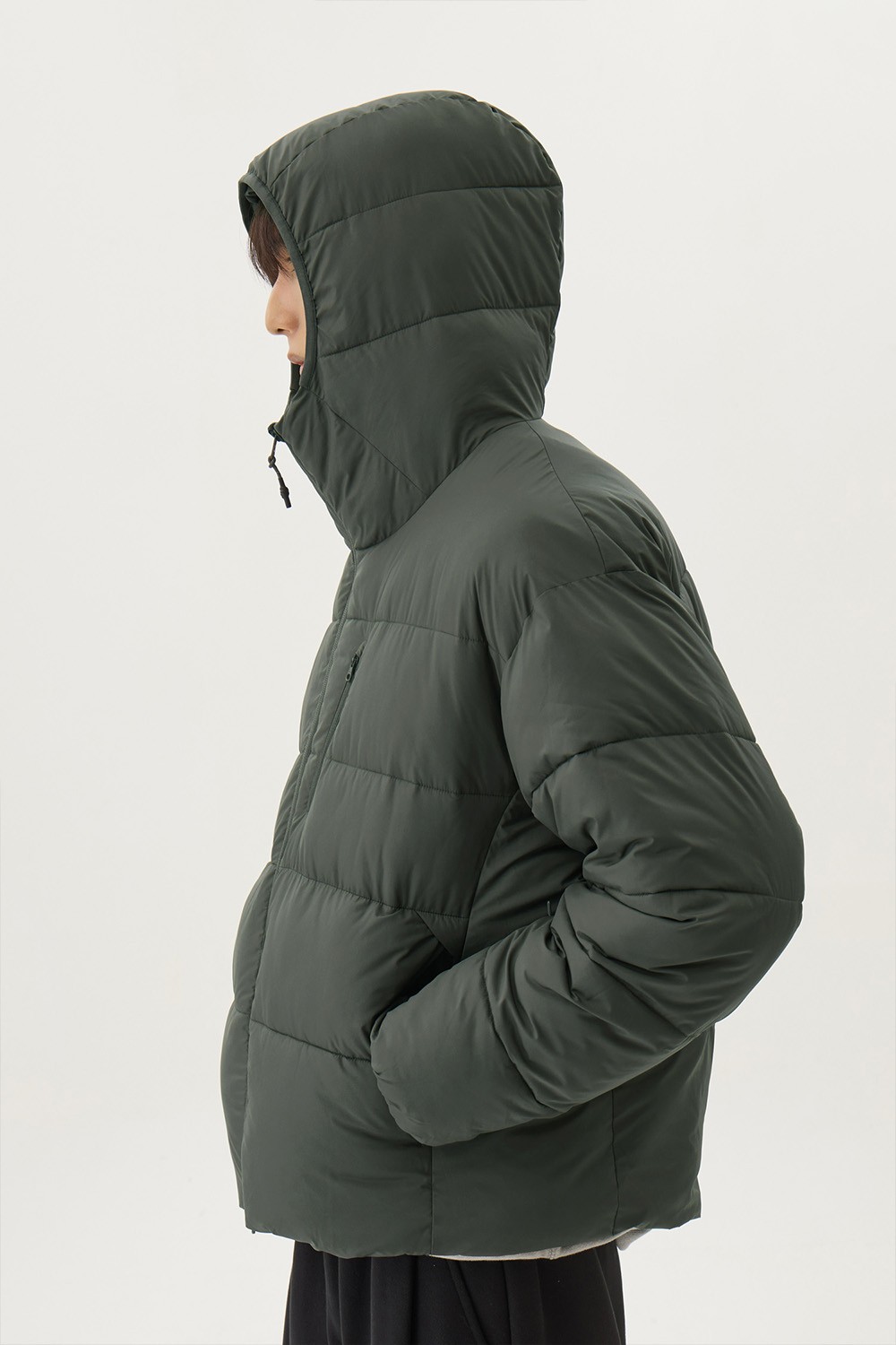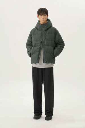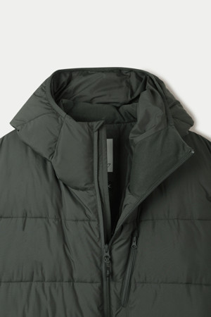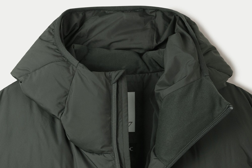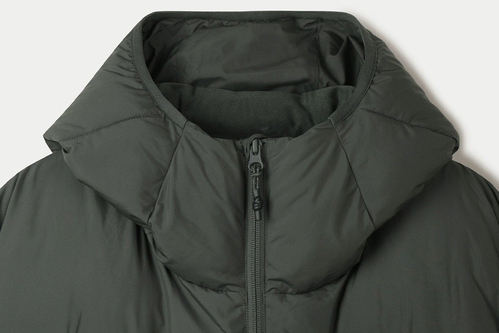 다운백 구조로 충전재가 고르게 분포되도록 설계하였으며, 후드와 넥라인 전체에는 기모 트리코트 안감을 사용해 민감한 부위의 착용감을 부드럽게 마감했습니다. 측면은 암홀부터 밑단까지 이어지는 일체형 사이드 패널 구조로 설계하여 봉제선에서 발생할 수 있는 불편함을 줄이고, 바람이 스며드는 것을 최소화했습니다.