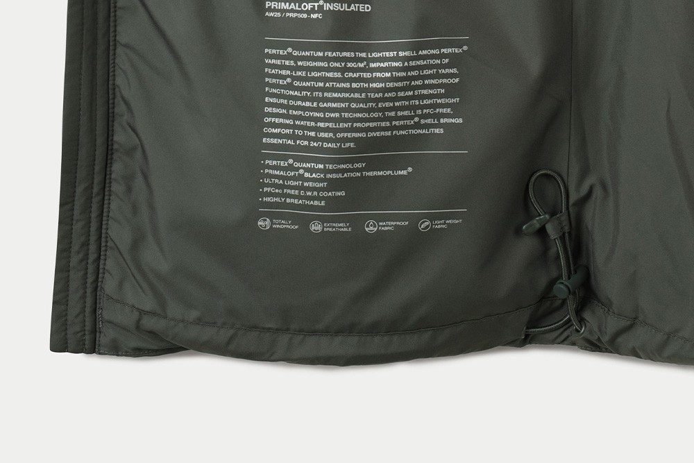 겉감과 안감 모두 초경량 고밀도 소재인 PERTEX® QUANTUM을 사용하여 가벼우면서도 방풍성과 내구성이 우수합니다.