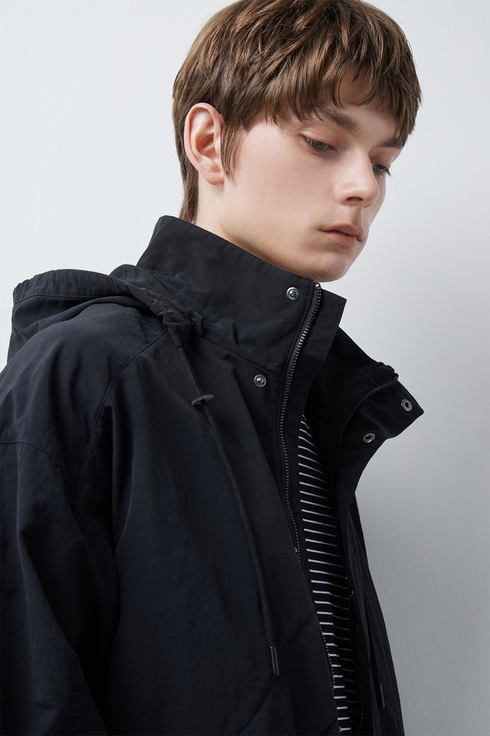 지퍼와 스냅 버튼을 결합한 이중 여밈 구조와 탈착 가능한 후드를 통해 기온 변화에 유연하게 대응할 수 있습니다. 여유 있는 오버사이즈 실루엣으로 설계되어 다양한 이너와 함께 편안한 레이어링이 가능합니다.