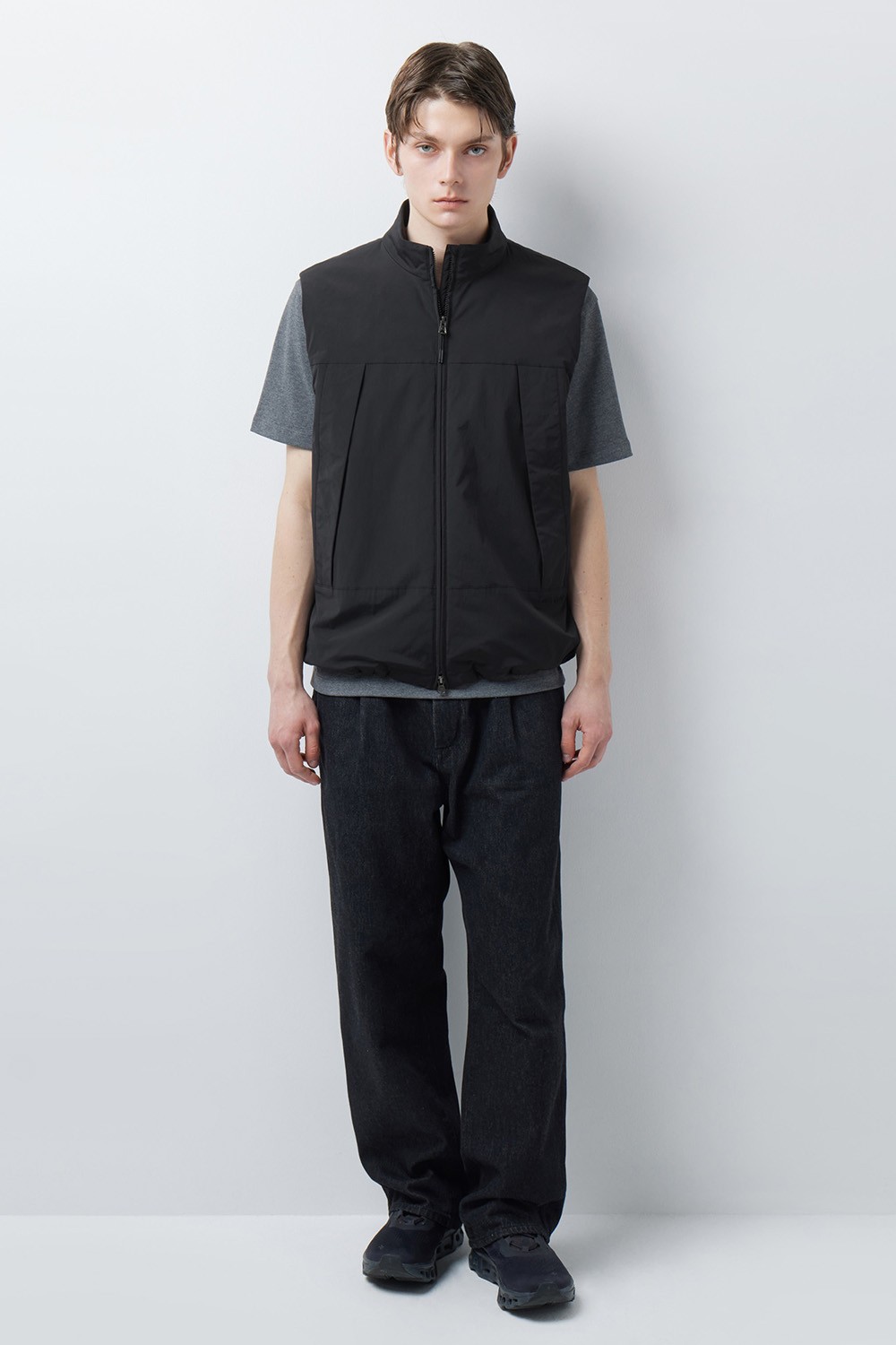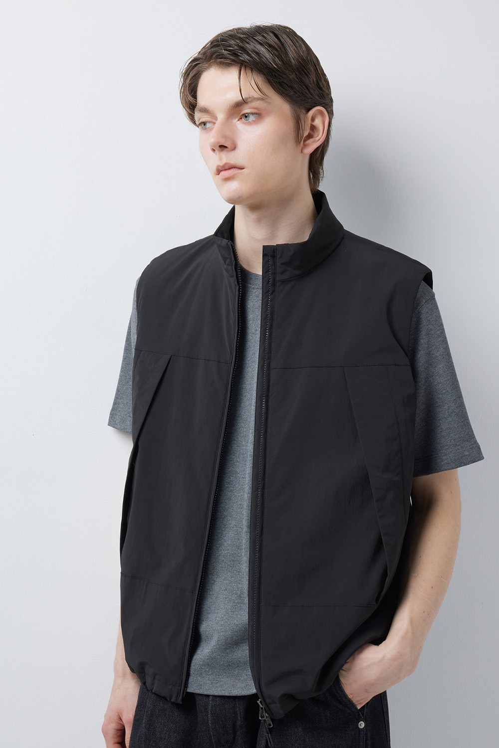 후면 지퍼 포켓과 내부의 세분화된 수납 공간으로 실용성을 극대화했으며, 밑단의 엘라스틱 스트링으로 원하는 실루엣을 자유롭게 조절할 수 있습니다. 얇고 가벼운 두께감 덕분에 간절기에는 단독 아우터로, 겨울철에는 헤비 아우터 속 레이어링 아이템으로 활용하기 좋은 범용성 높은 베스트입니다.