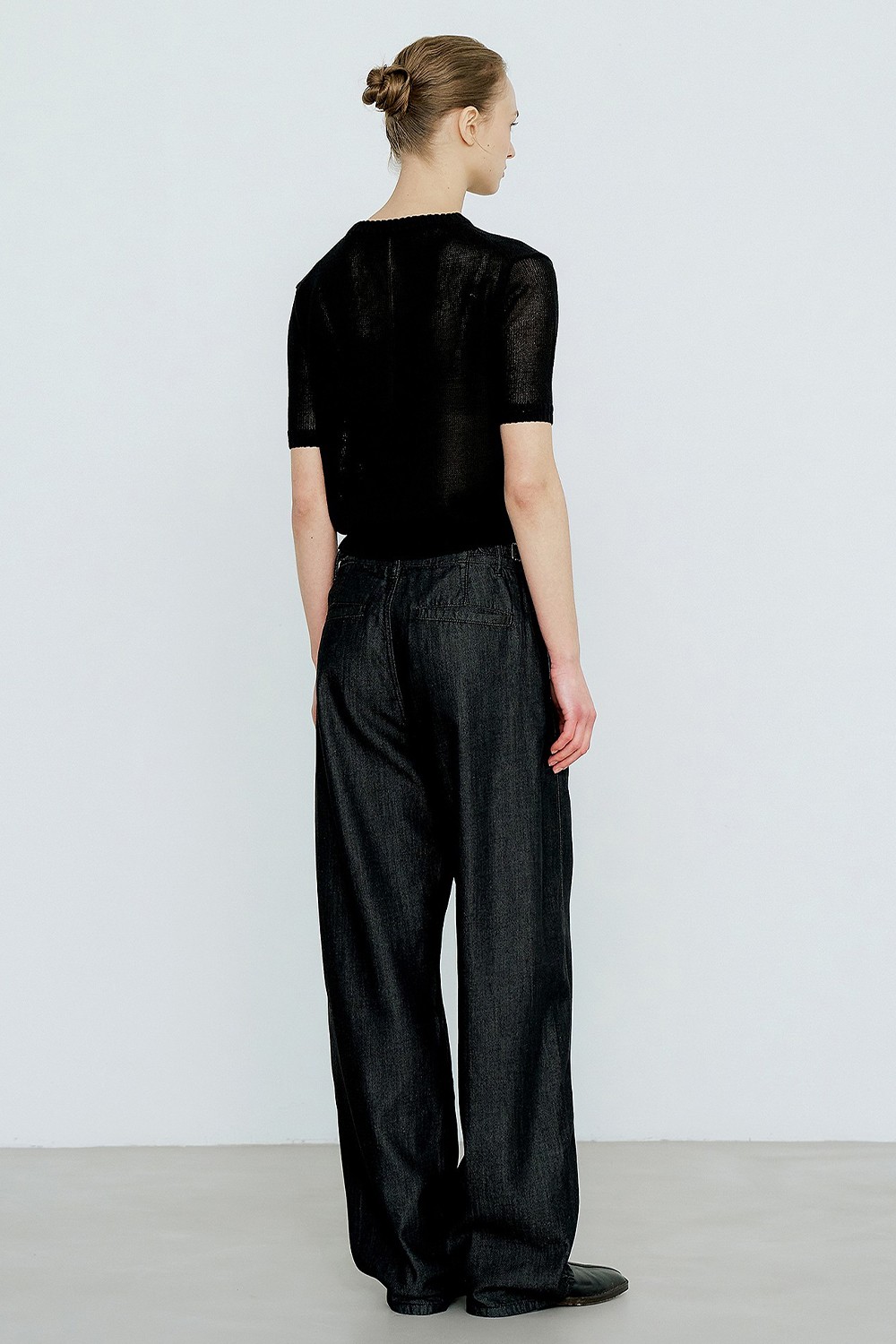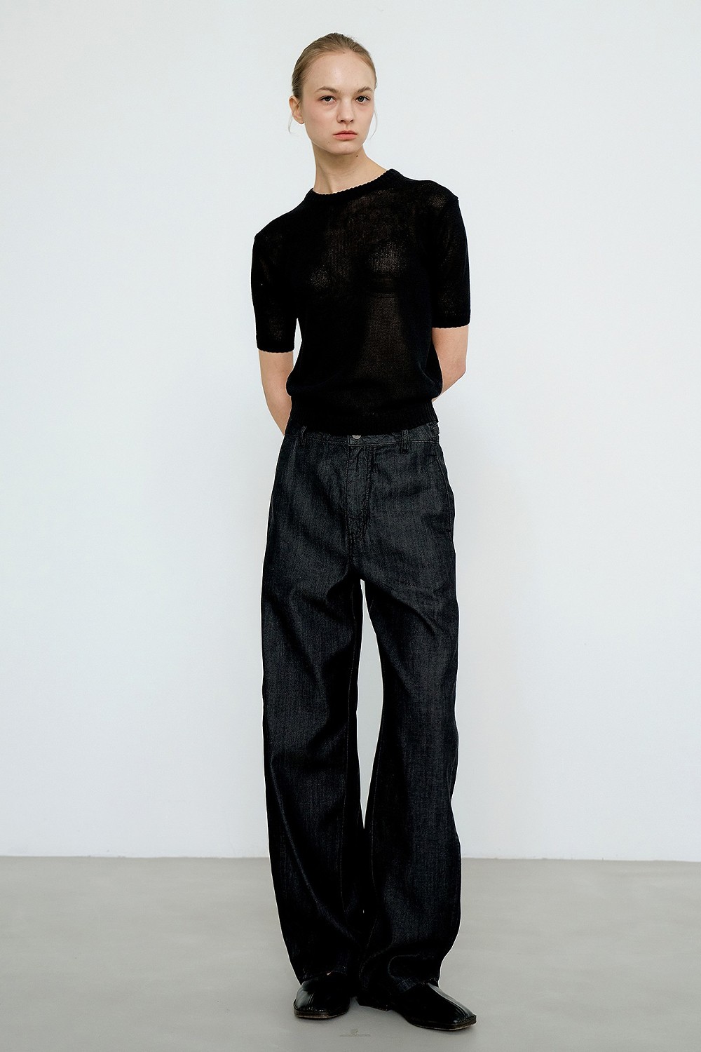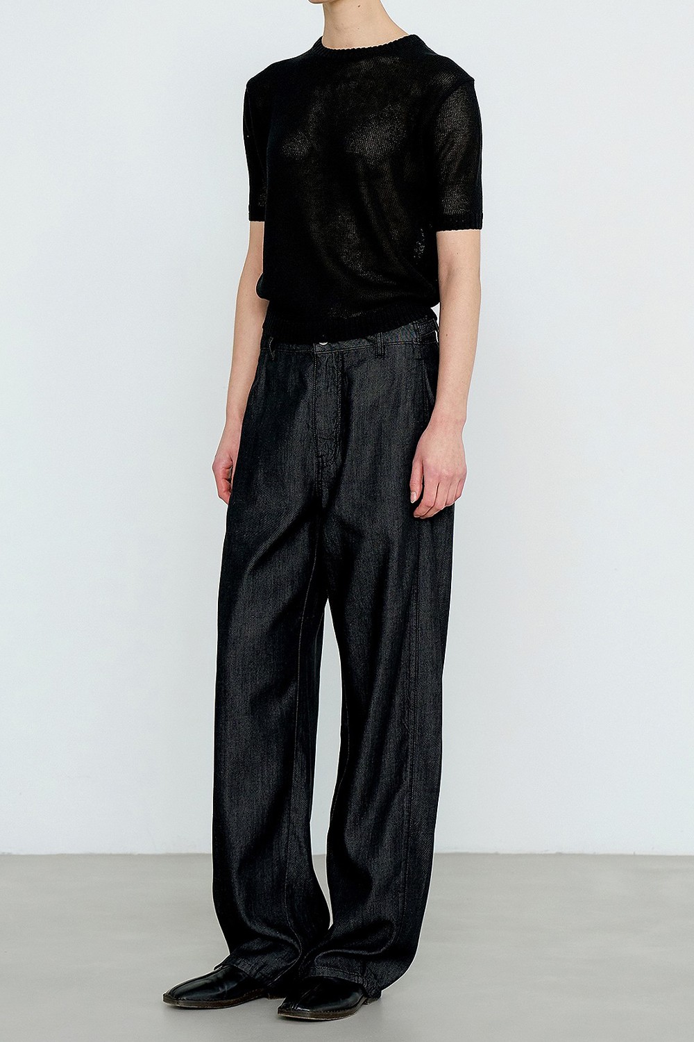 A : 일반적인 데님 팬츠보다 훨씬 가볍고 얇게 제작되었습니다. 부드러운 소재감과 세미와이드 커브드 실루엣이 만나 통기성과 쾌적함을 동시에 제공하므로 가볍고 편안하게 착용하기 좋습니다.