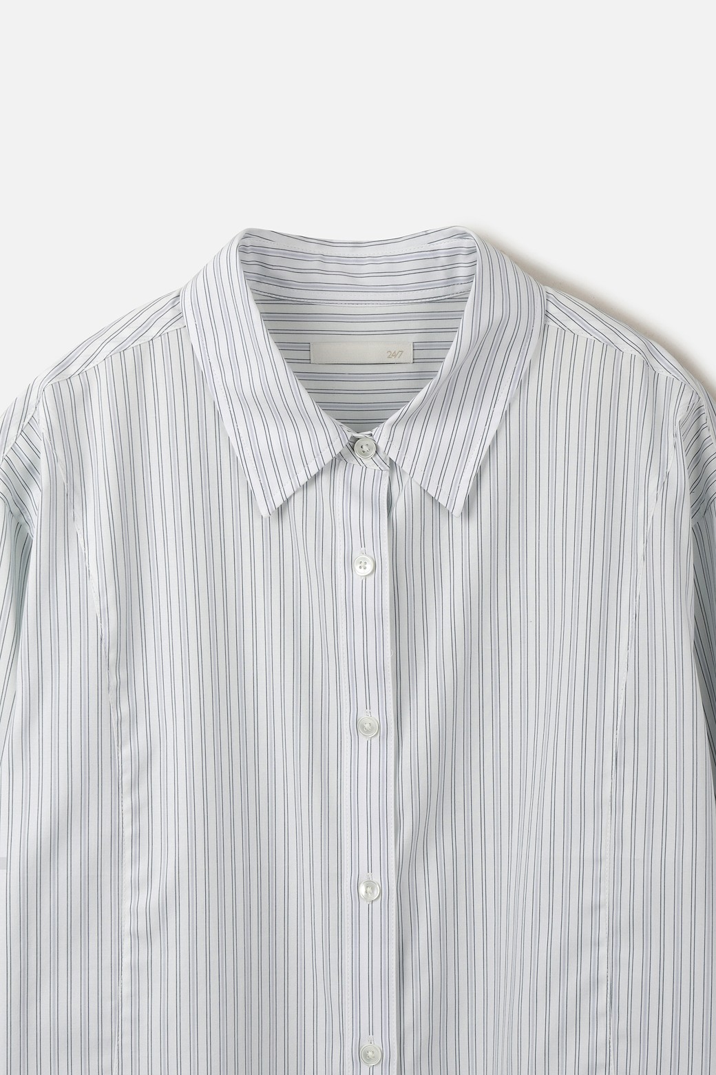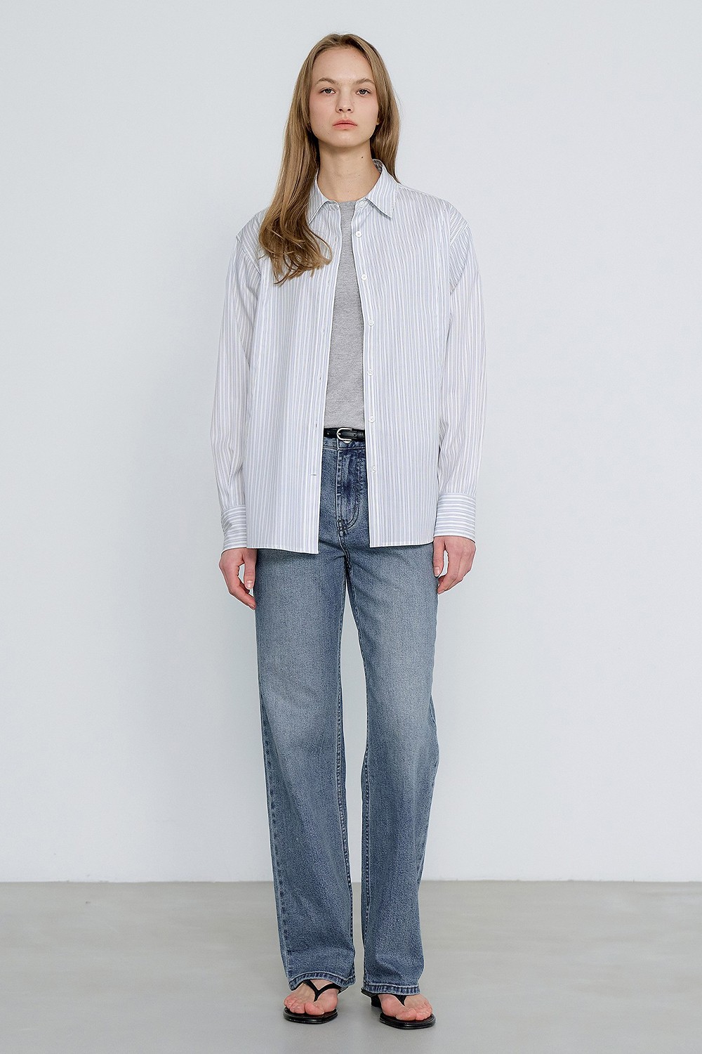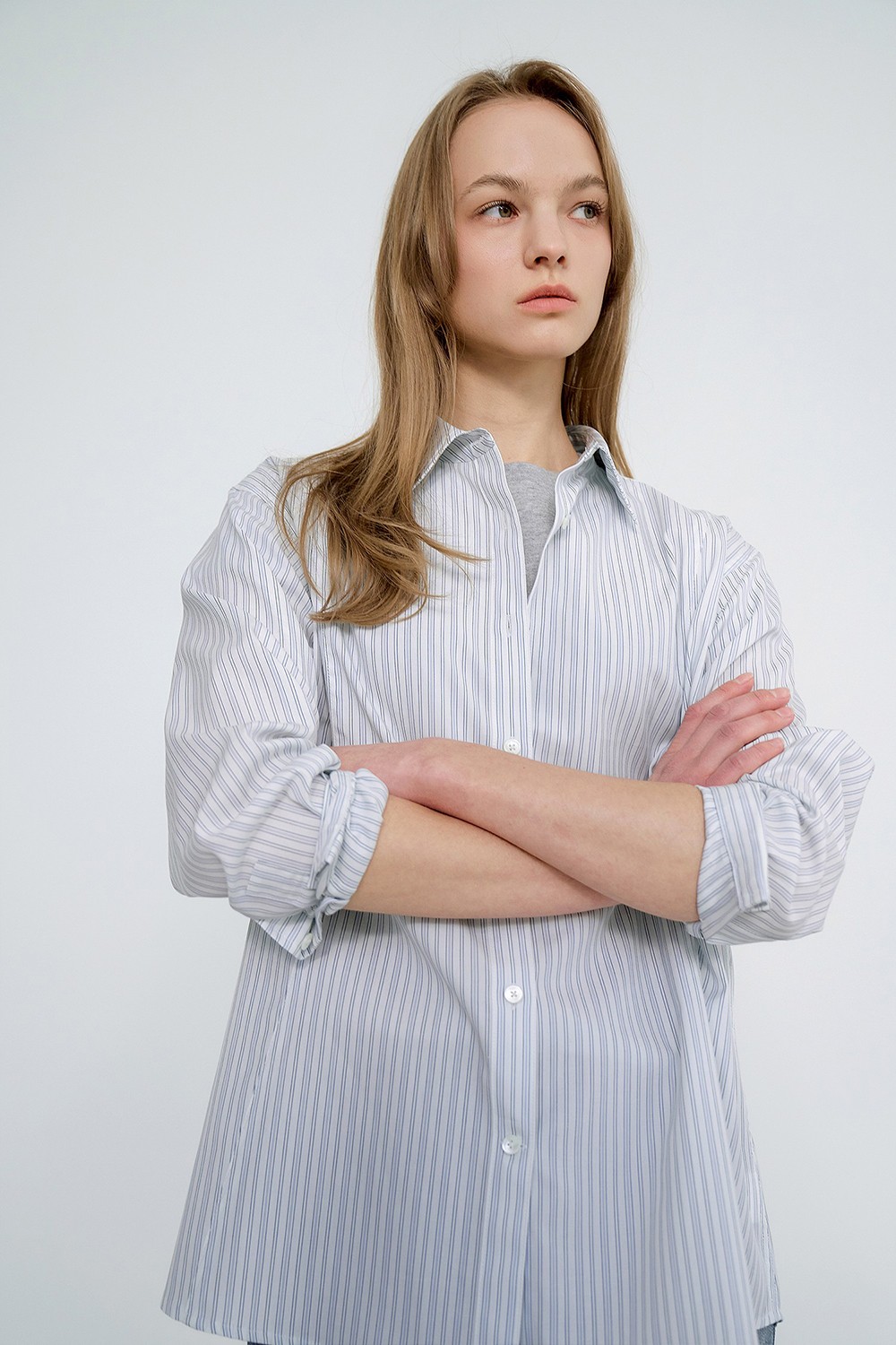 하늘한 스트라이프 소재와 여유 있는 실루엣으로, 자연스럽고 부드러운 무드의 셔츠입니다.